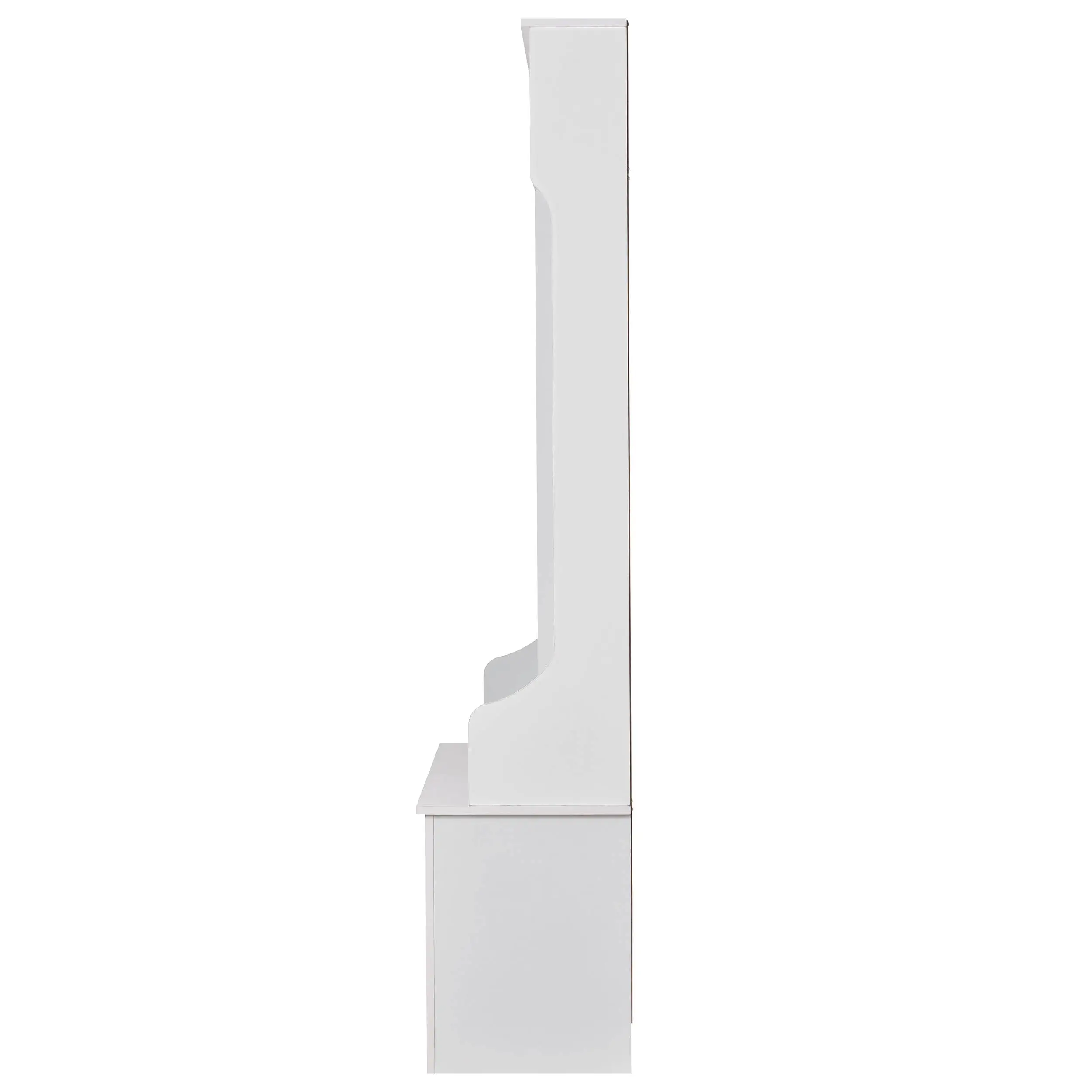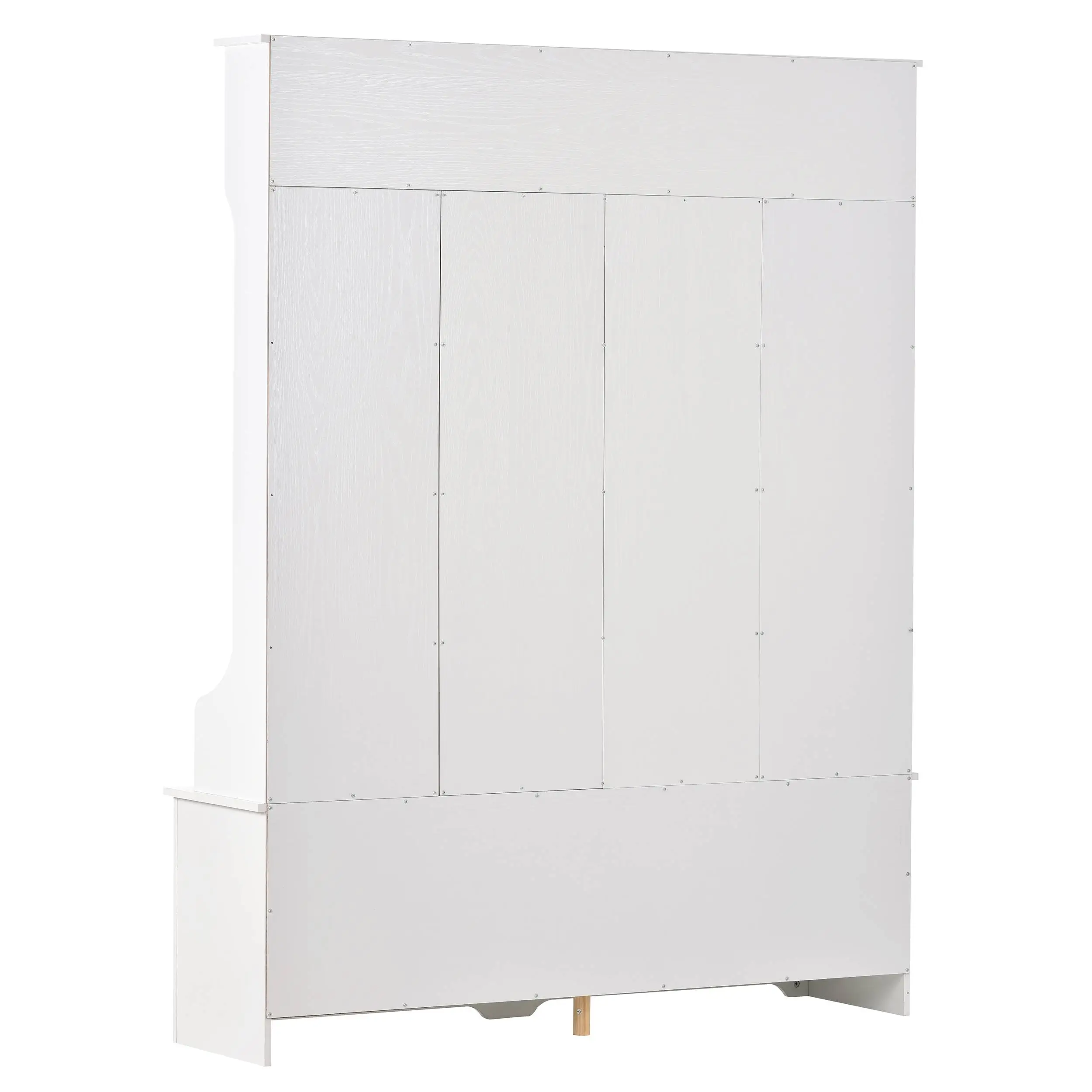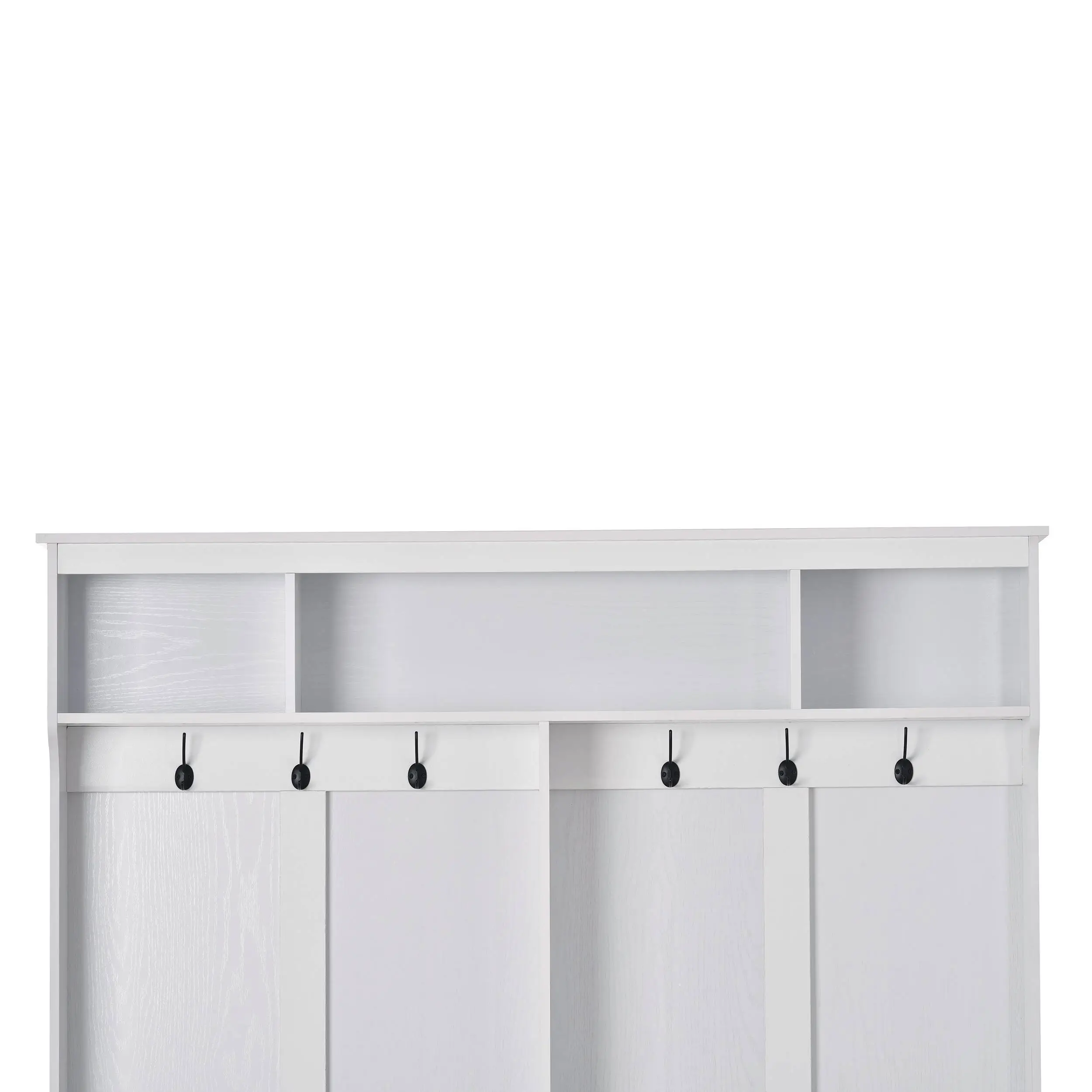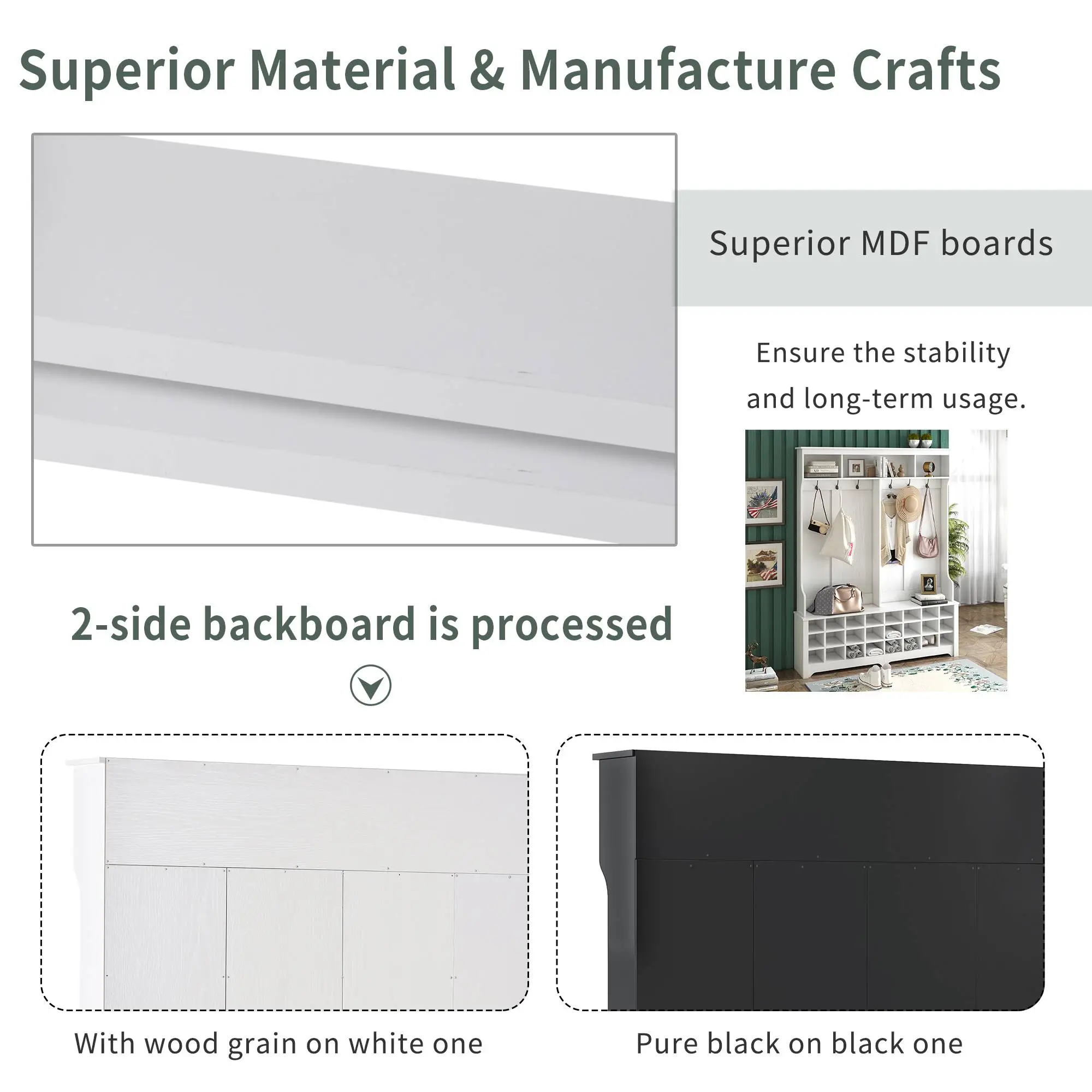 Such a functional furniture located at entryway needs high quality material to ensure the stability and long-term usage. In this case, this hallway coat rack is made of MDF boards to guarantee the durability in usage. The 2-side backboard of this furniture is processed with wood grain on white one, and with pure black on black one.