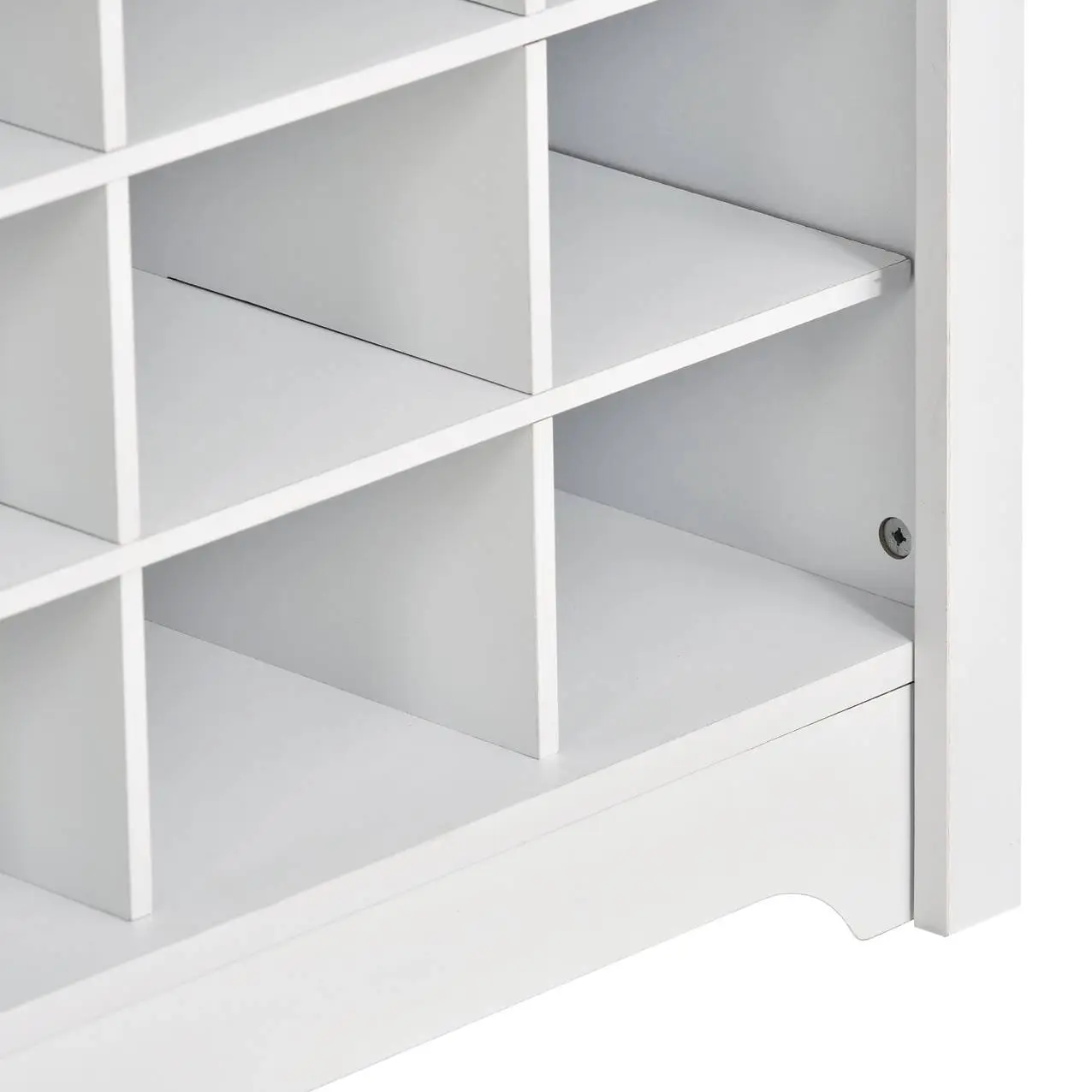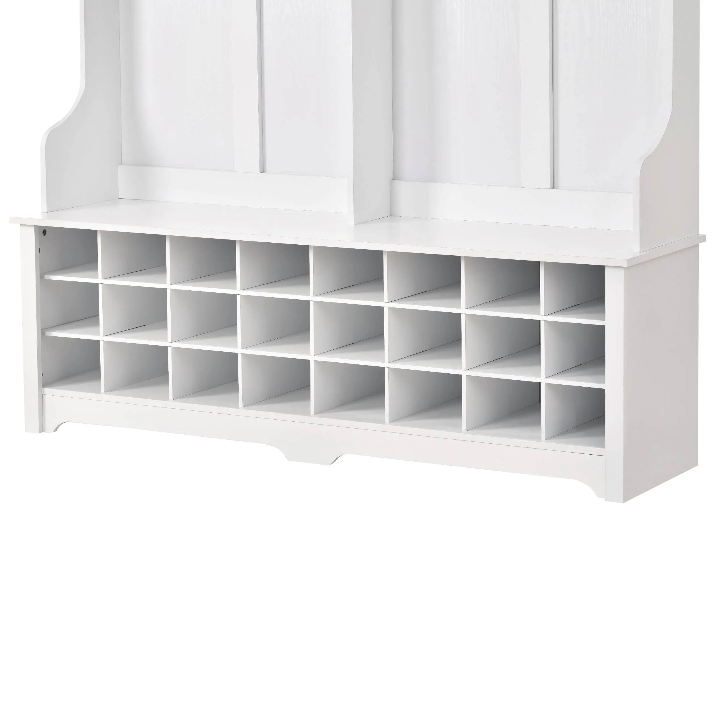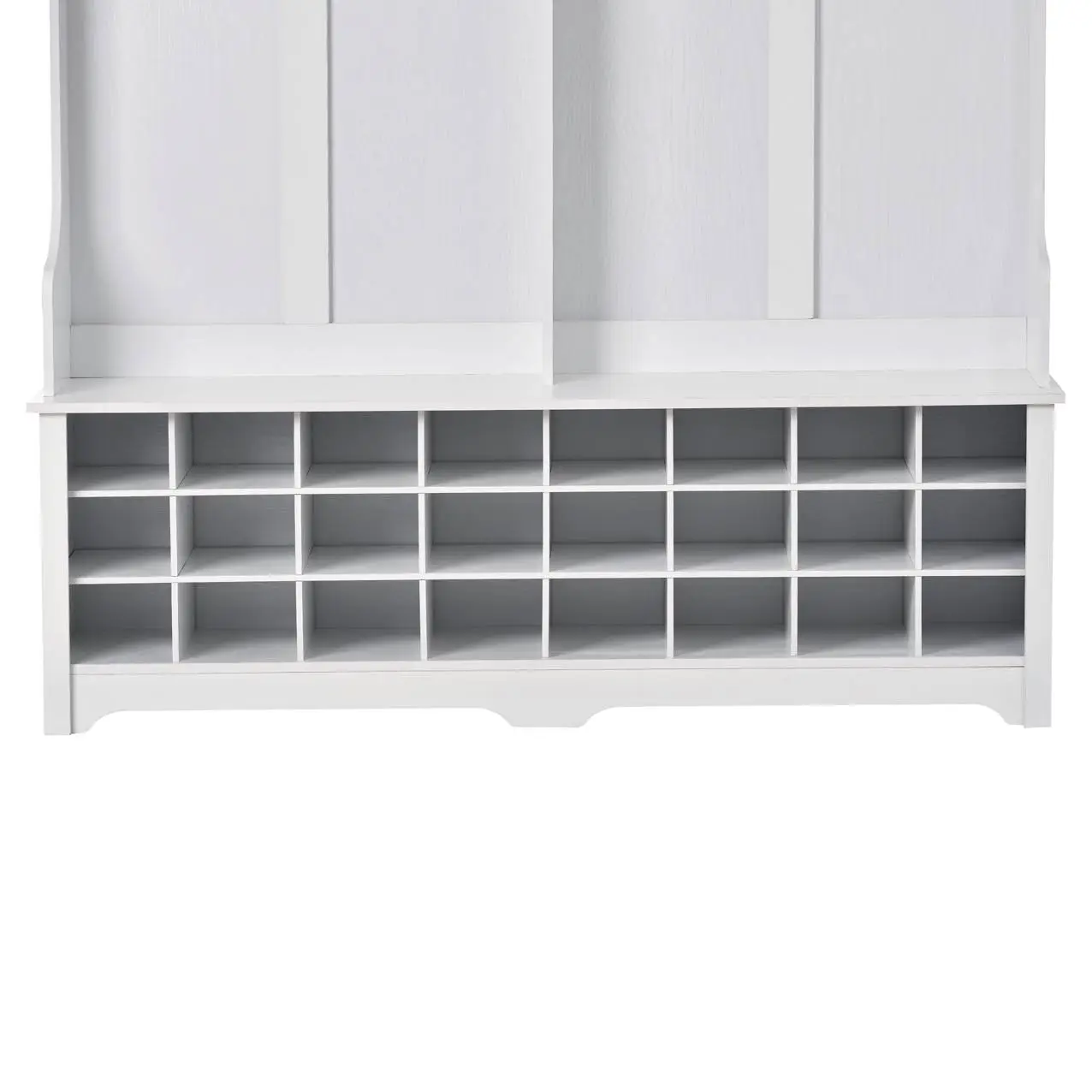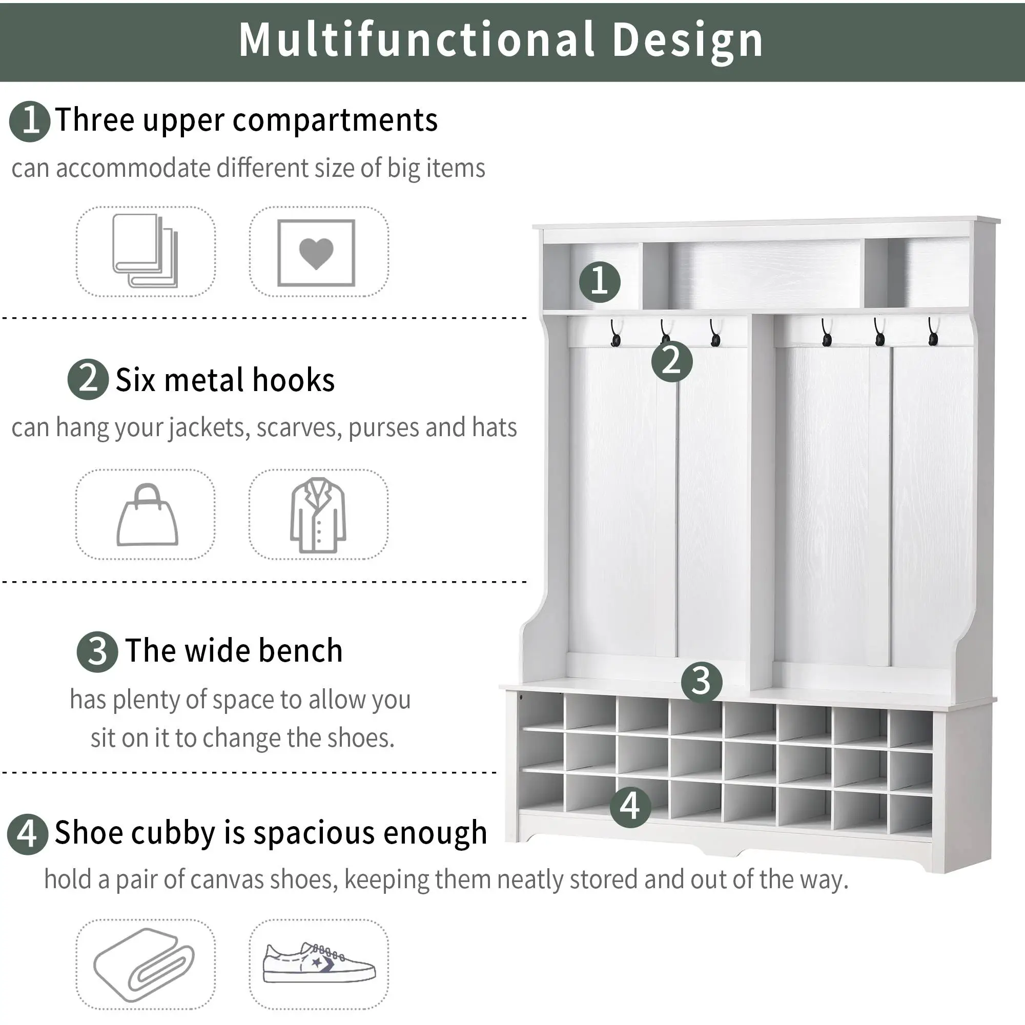 The three upper compartments can accommodate different size of big items, and the six metal hooks can hang your jackets, scarves, purses and hats. The wide bench sits on top of 24 individual shoe cubbies, and it has plenty of space to allow you sit on it to change the shoes. Each shoe cubby is spacious enough to hold a pair of canvas shoes, keeping them neatly stored and out of the way.