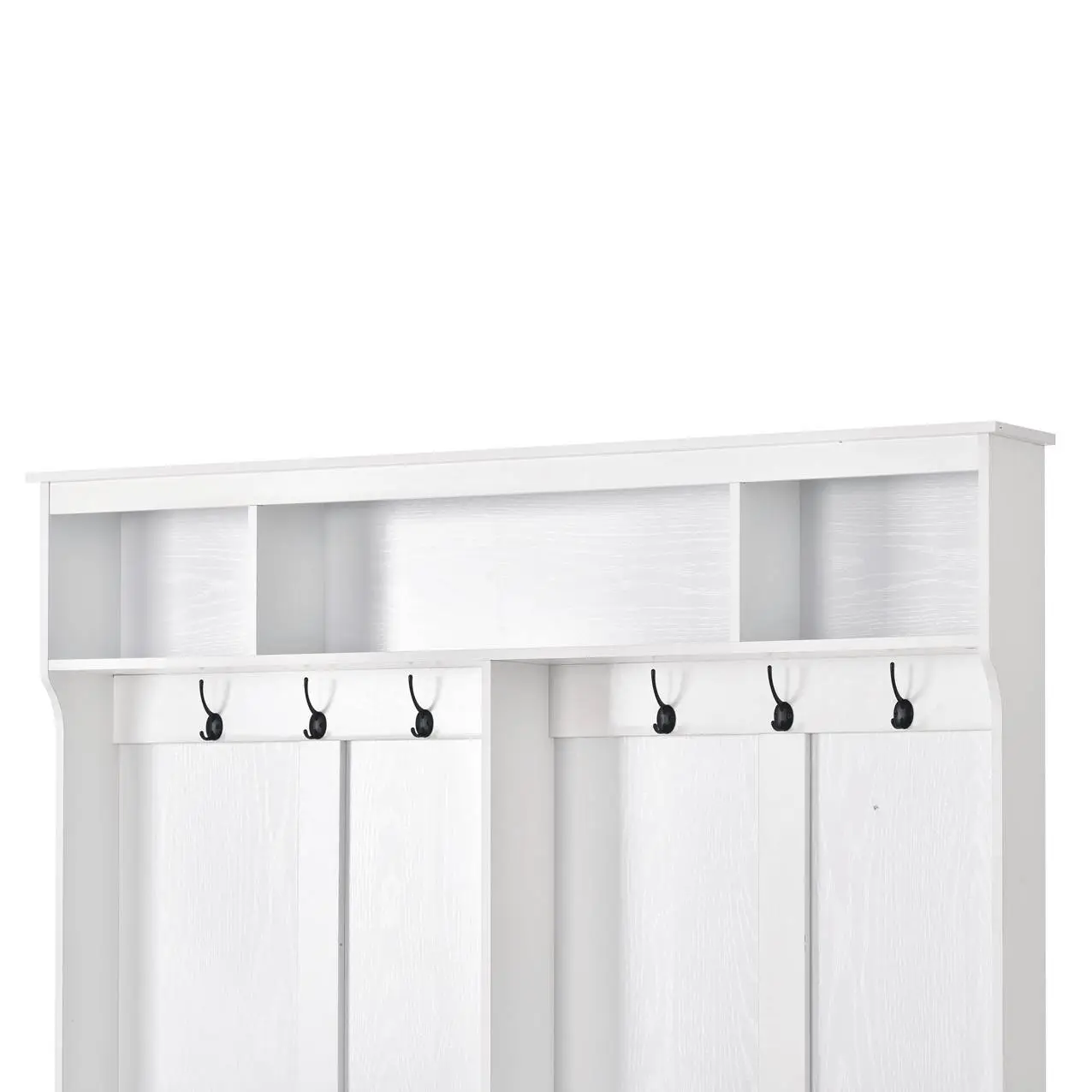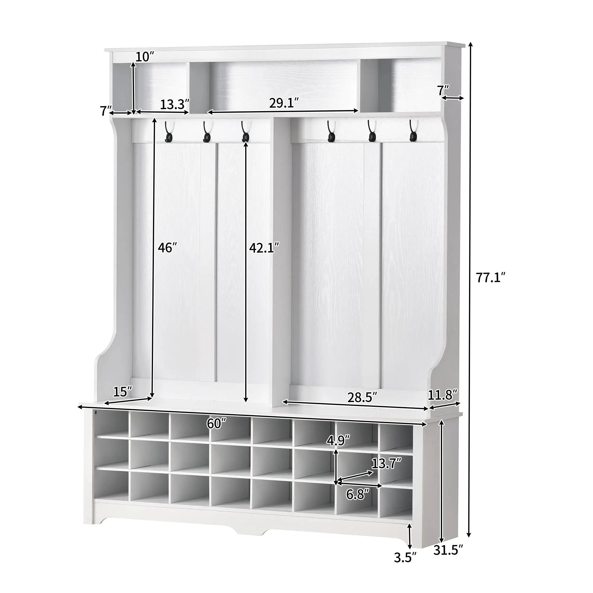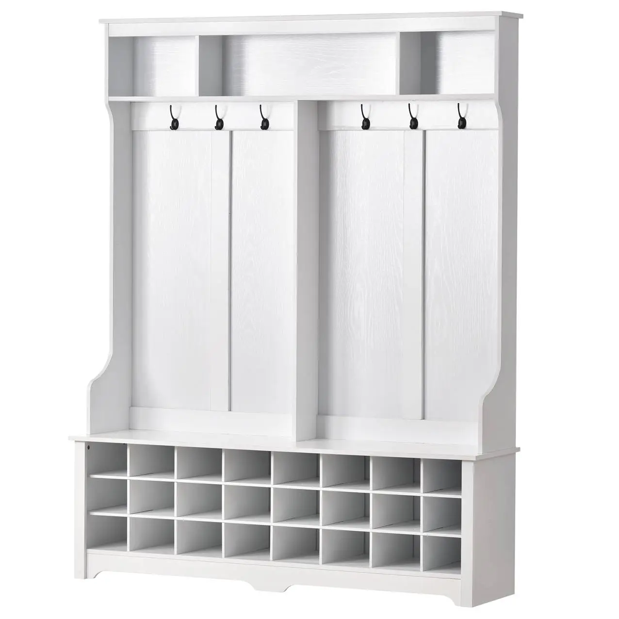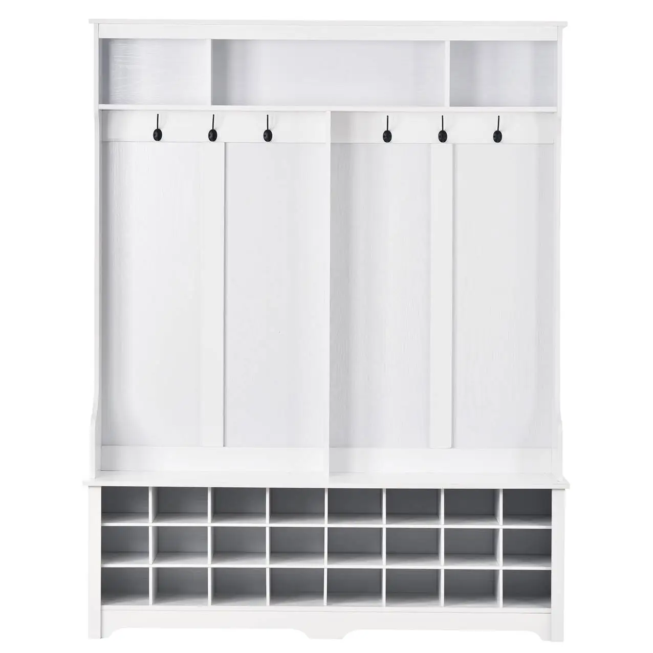 This modern style hallway coat rack has simple and clean lines, and the multiple functional design makes this furniture be a perfect choice for your entryway space. Several kinds of storage space offer ample and different space to storage different size of items. The number of shoe cubby at the bottom of this furniture are rich to 24, this part will be a great place for your shoes. Details and accessories for safety also make it easy for users to use in daily life. High quality materials guarantee the stability and durability in long-term usage. White and black color options of this product allow you to pick the prefer one as you wish.