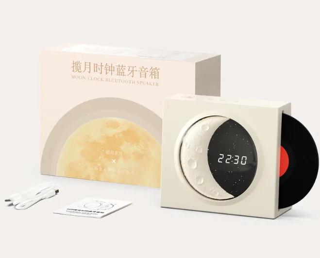 Designed with a retro vinyl look, the Moon Clock Bluetooth Speaker serves as both a functional clock and a high-quality speaker, making it a great addition to your decor. Whether you're using it for listening to music, checking the time, or simply adding a touch of nostalgia to your room, this Bluetooth speaker delivers great sound and a stylish design all in one.