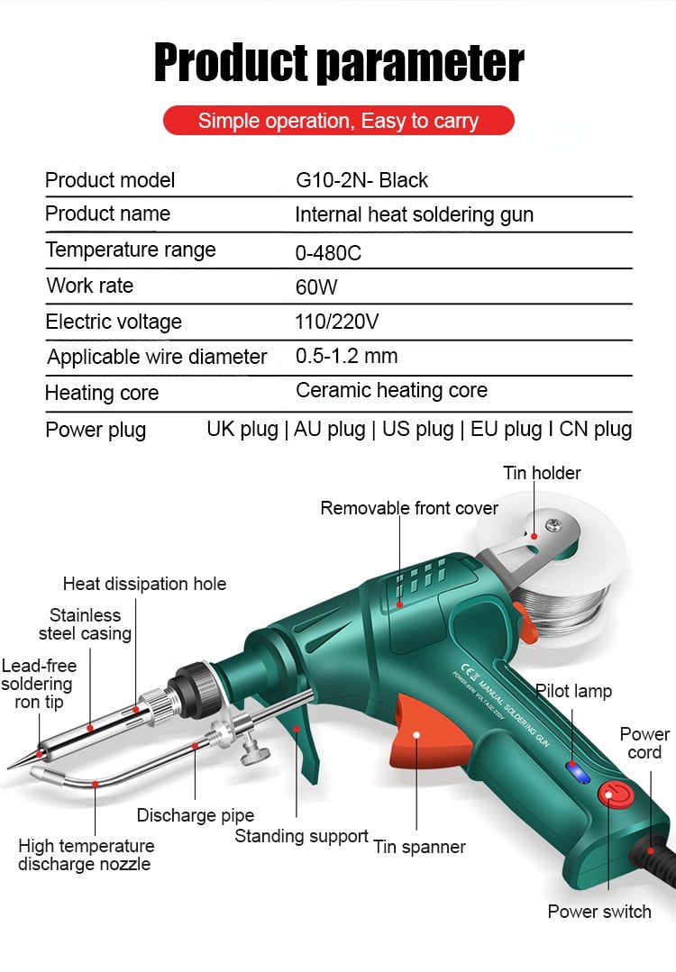 The multi-function soldering iron soldering gun set is a versatile, high-performance tool designed for both beginners and professionals. This 60W soldering gun heats quickly, reaching working temperatures in seconds to save time during complex soldering tasks. Whether you’re working on circuit boards, home repairs, or DIY projects, this set provides precision and reliability for a variety of applications.