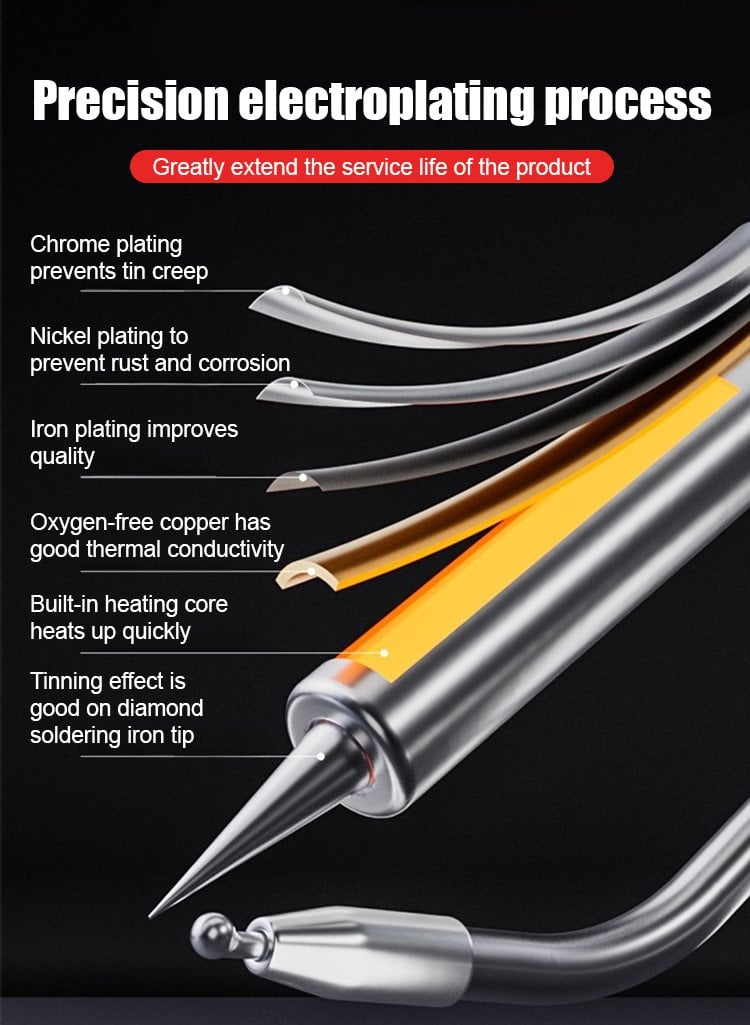 Equipped with an external heating element, the soldering iron delivers stable heat for continuous use without damaging