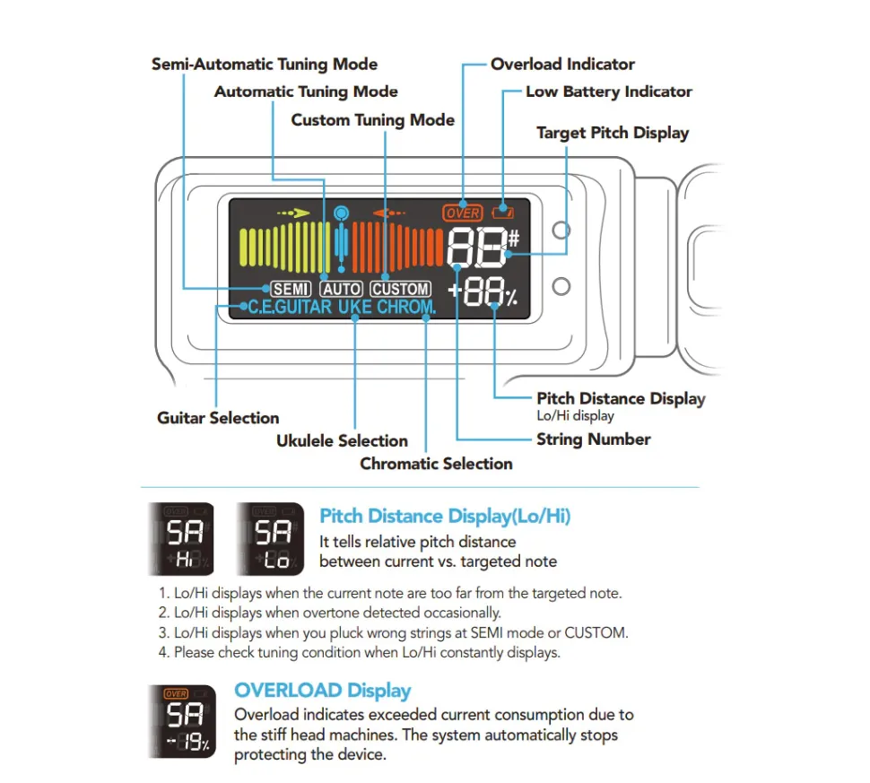 Suitable for acoustic guitar, classic guitar, electric guitar, ukulele and chromatic tuning, and with colorful LCD display showing the