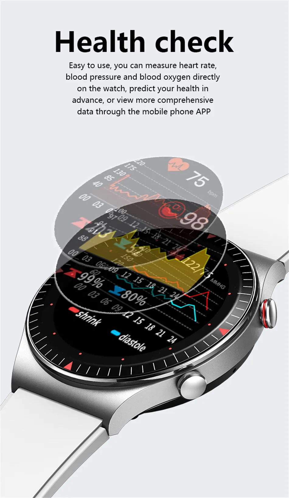The smartwatch’s sleek, modern design makes it an elegant accessory for any outfit. Its high-resolution touchscreen display allows for easy navigation and is perfect for viewing notifications, messages, and health data.