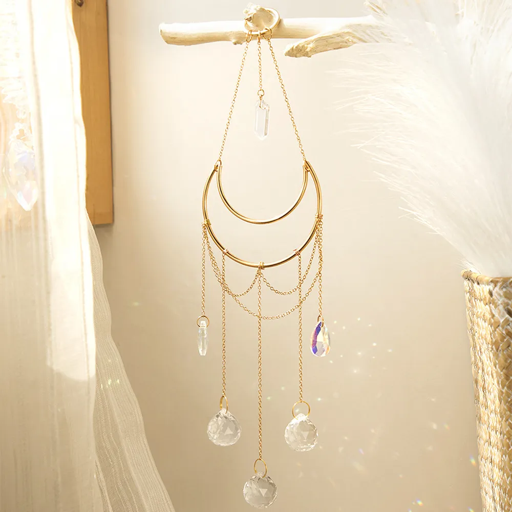 The crescent shape symbolizes transformation, emotional balance, and new beginnings. It represents the cyclical nature of life and encourages spiritual growth and healing.