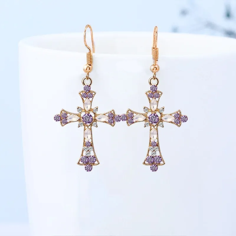 To complement the stunning necklace, this set also includes a pair of matching earrings, each featuring a small cross design with purple diamonds. These earrings add an elegant and coordinated touch to your look, making the set ideal for formal events, church services, or even as a beautiful everyday accessory.