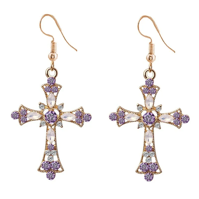 To complement the stunning necklace, this set also includes a pair of matching earrings, each featuring a small cross design with purple diamonds. These earrings add an elegant and coordinated touch to your look, making the set ideal for formal events, church services, or even as a beautiful everyday accessory.