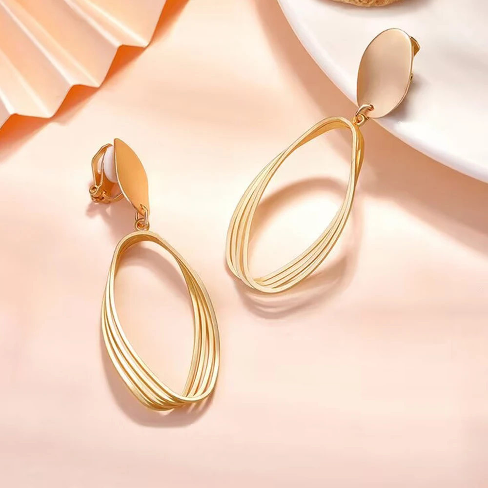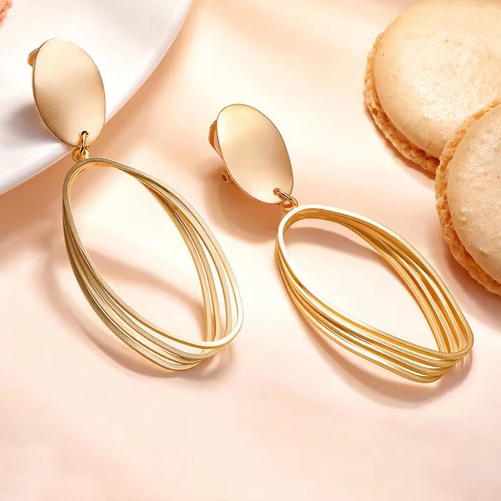 New Geometry Retro Metallic Gold Color Multiple Oval Pendant Clip Earrings - Fashion Jewelry for Wedding & Party