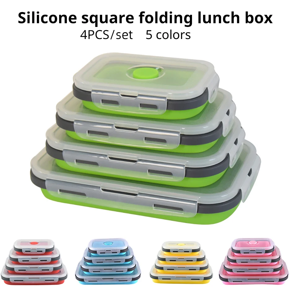 Number of Tiers: 1-tier, Color: Red - 4PCS Foldable Silicone Lunch Box Portable Microwave Heated Lunch Box Square Silicone Preservation Box Kitchen Supplies