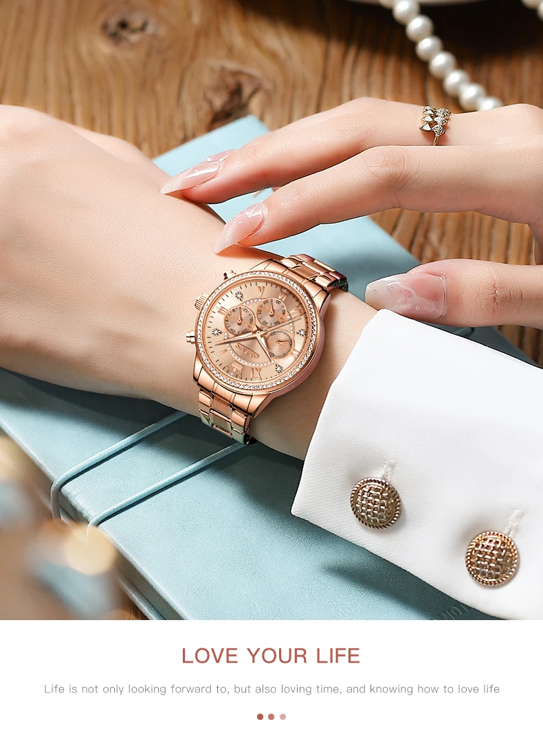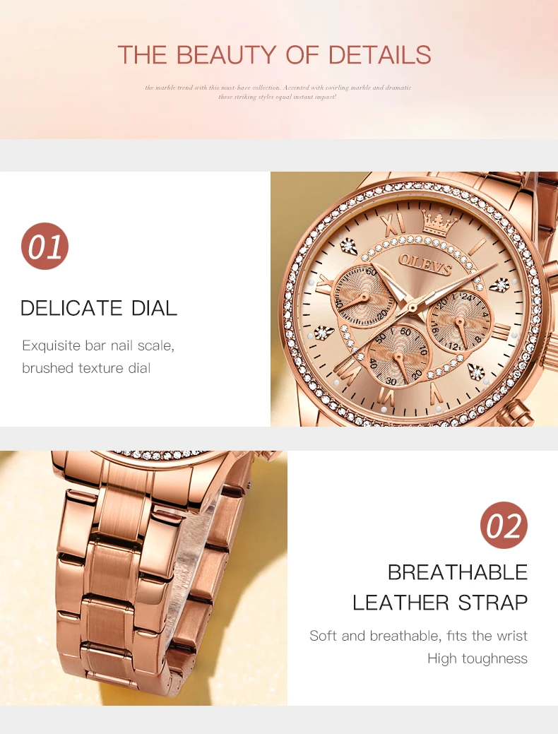 The OLEVS Women’s Quartz Watch is not just about looking good, it’s also about providing functionality. The three small dials offer additional features that are both useful and stylish. These small dials typically represent: