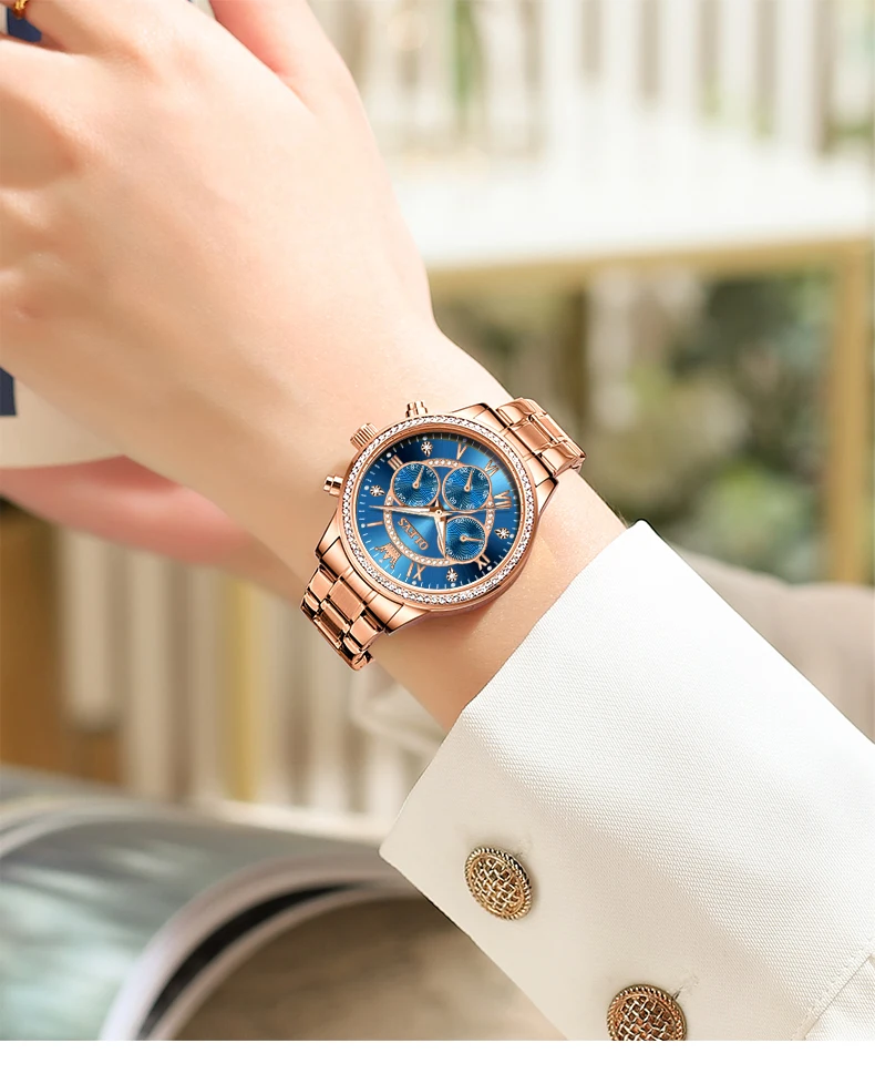 The attention to detail in this watch is remarkable. Every component, from the diamond dial to the gold stainless steel case, has been designed to make a lasting impression. The three small dials not only add to the aesthetics but also serve a practical purpose, displaying features such as the date, 24-hour time, and chronograph function, making this watch both a fashion accessory and a useful tool for your everyday life.