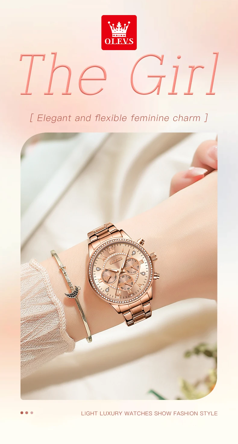 When it comes to timepieces, there's no better way to showcase your elegance and sophistication than with the OLEVS Women’s Quartz Watch with Diamond Dial. This gold stainless steel watch blends timeless luxury with modern precision, providing women with a versatile and stylish accessory that is perfect for any occasion. Adorned with a luxury diamond dial and featuring a waterproof design, this watch is more than just a way to keep track of time—it’s a statement piece that enhances your style and reflects your personality. With its three small dials offering enhanced functionality and beauty, this fashion-forward wristwatch ensures you’re not just on time, but also in style.