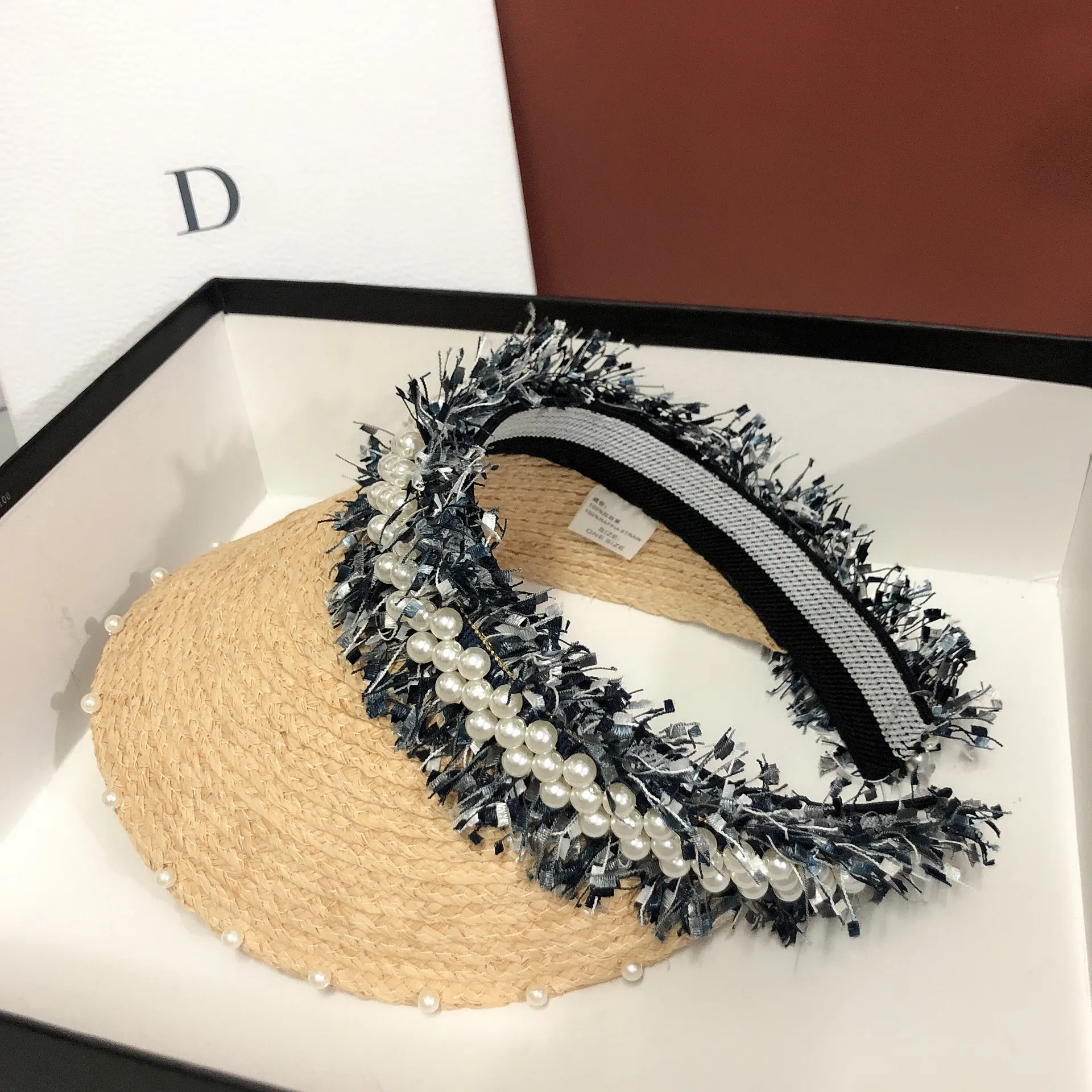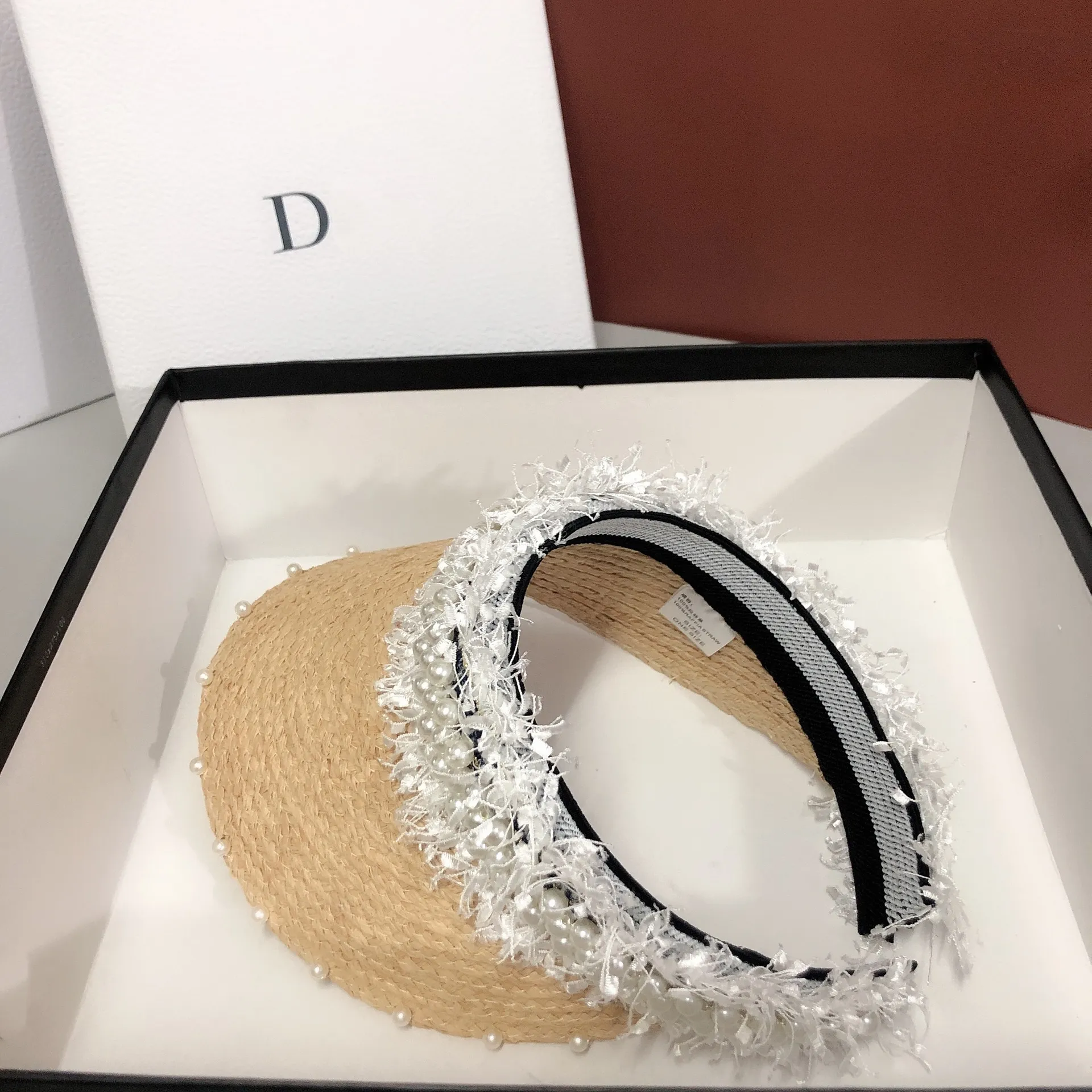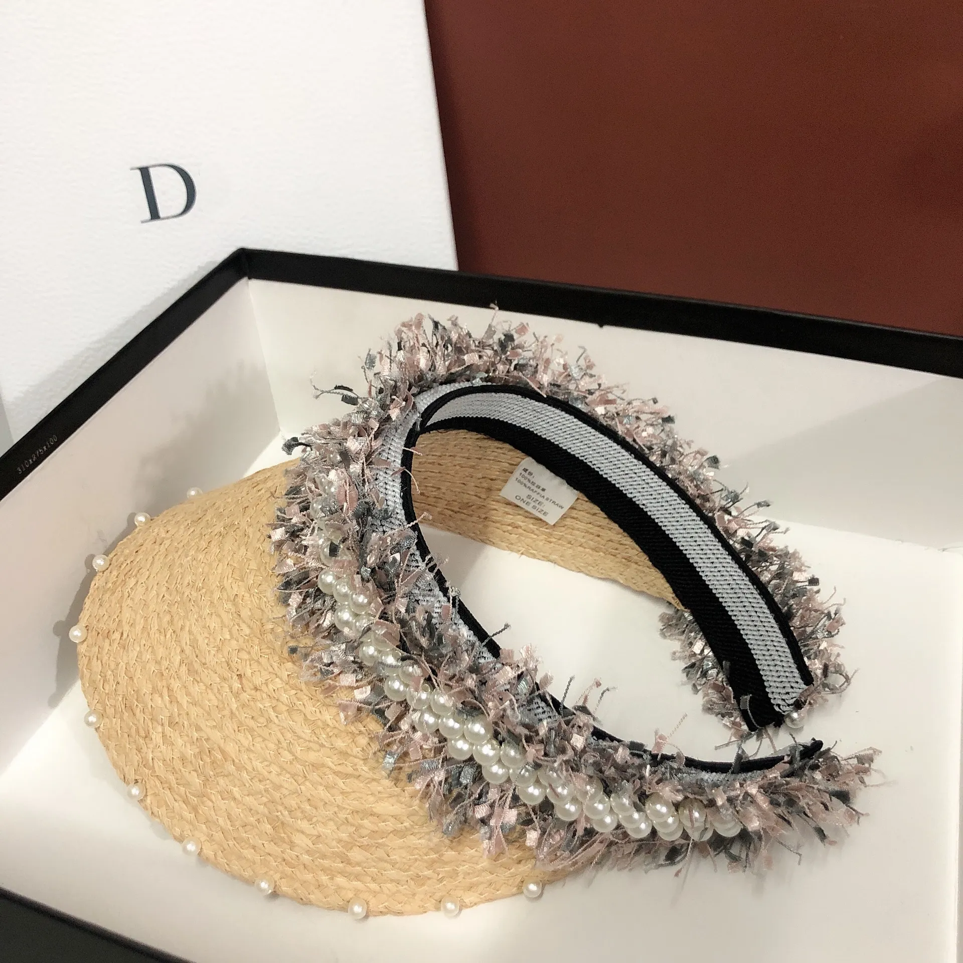 Crafted from high-quality straw, the Pearl Straw Empty Top Hat features a unique "empty top" design, offering excellent ventilation to keep your head cool during hot weather. The hat is adorned with a band of faux pearls, adding a luxurious touch to its appearance. Its wide brim provides ample shade, protecting your face and neck from harmful UV rays.