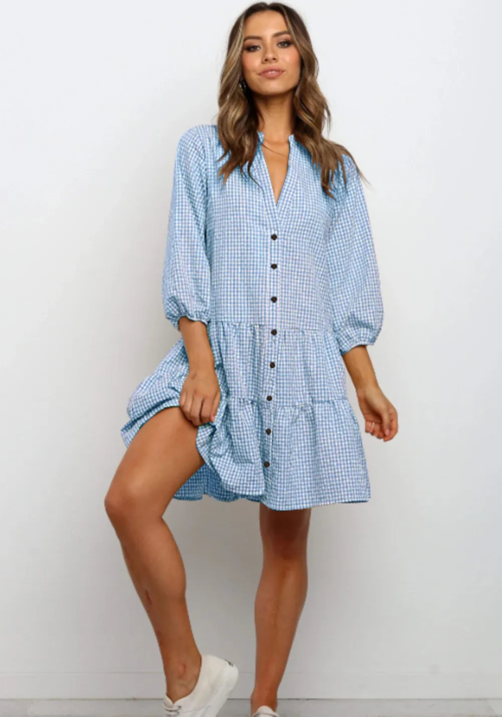 "Plaid ruffle dress, V-neck dress, three-quarter sleeve dress, women's plaid dress, button-down dress, casual plaid dress, stylish women's dress, versatile dress, comfortable women's dress, fashionable plaid dress"