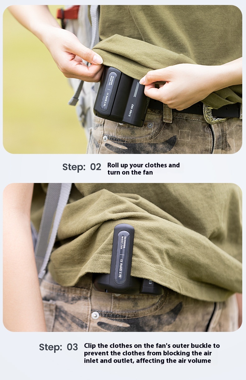 2. Adjustable Airflow: With three adjustable speeds, the waist fan lets you personalize your air flow and stay hands-free for unrestricted movement during outdoor activities.