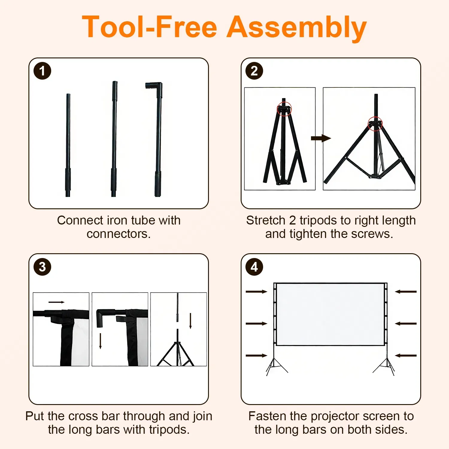 The stand includes height-adjustable poles, allowing you to raise or lower the screen for optimal viewing in any environment. The wide base design ensures the stand remains sturdy, even when set up on carpet, hardwood, or uneven outdoor ground. Each section locks securely with adjustable knobs, giving you precise control over height and angle.