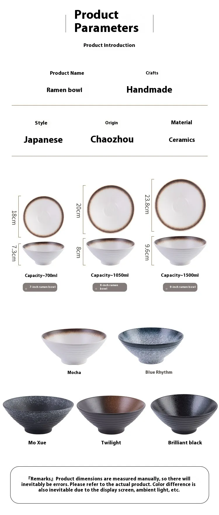 Specifications: 7-inch ramen bowl, 8-inch ramen bowl, 9-inch ramen bowl