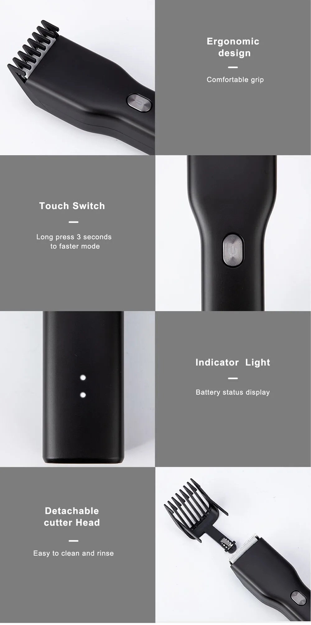 ●The skin contact part with cutting head and comb is round to ensure safety and comfort when cutting hair