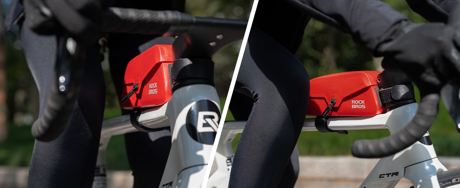 - ROTARY TIGHTENING SYSTEM: The innovative button-tightening design, paired with high-strength straps, helps secure the bag quickly and preventing sagging, and the wide straps ensure a secure and stable fit. Cycling pouch’ slim shape and tight fit to the frame prevent leg contact, allowing you to ride freely without interference