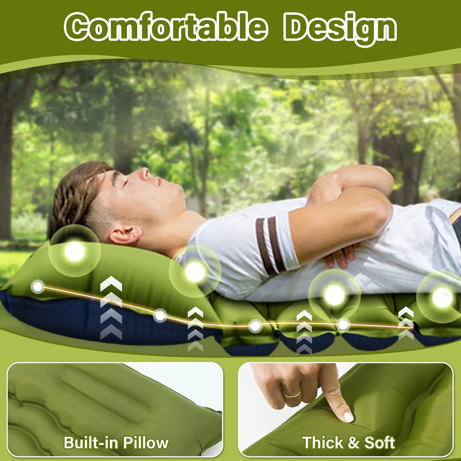 1. The air mattress is designed to be larger in size, providing spacious space and strong support, large enough to accommodate 2 people, no matter how you flip it will not hit the ground, and the pillow built into the camping mat fits every sleeping position, giving you every comfortable and warm night of sleep.
