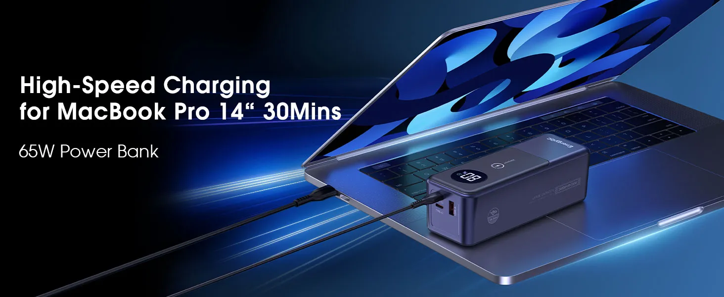 The PD65W power bank features a sleek, minimalist design that complements modern laptops and professional gear. Its compact form factor makes it easy to carry, while its modern aesthetic ensures it looks as good as it performs.