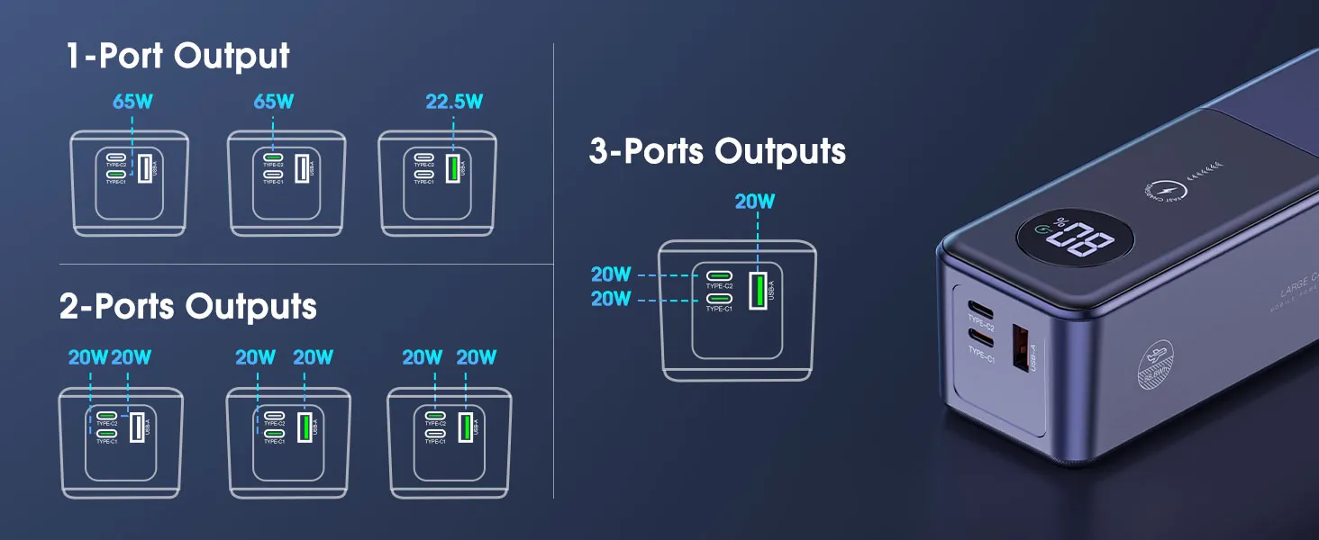 Unlike multi-port power banks that may split power across devices, the single-port design of the PD65W power bank concentrates its energy on one device, ensuring the fastest and most efficient charging. This is perfect for professionals who need their notebook fully charged as quickly as possible.