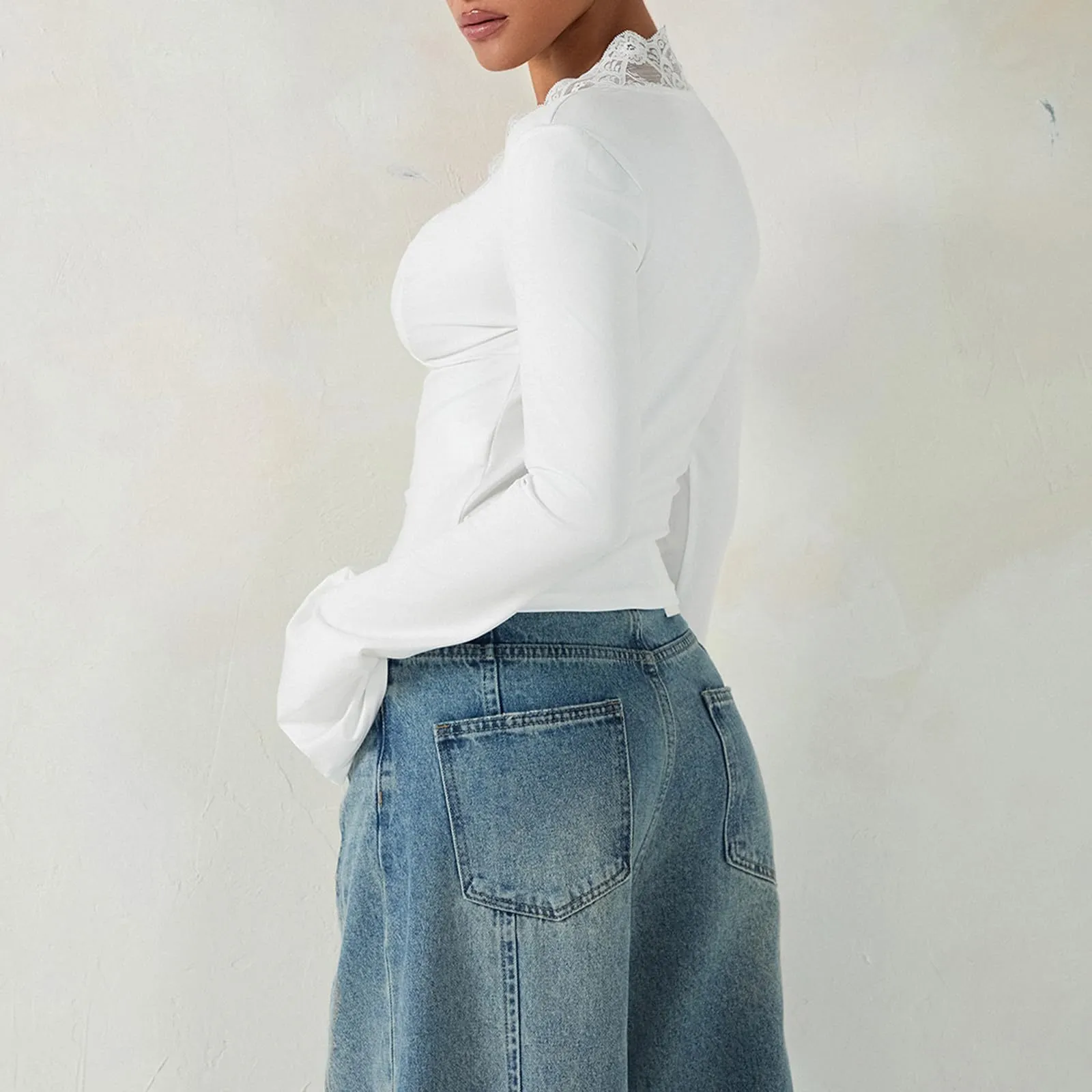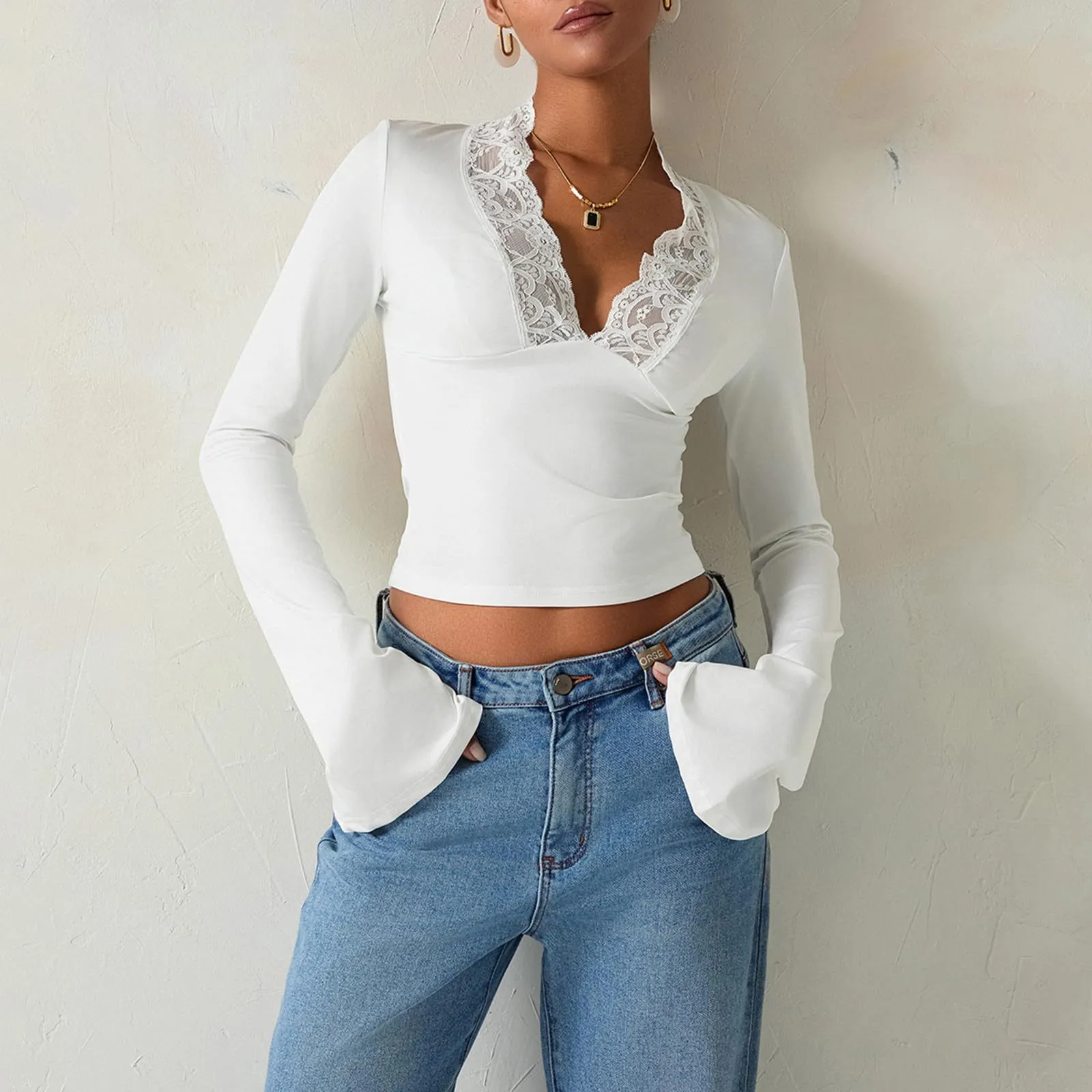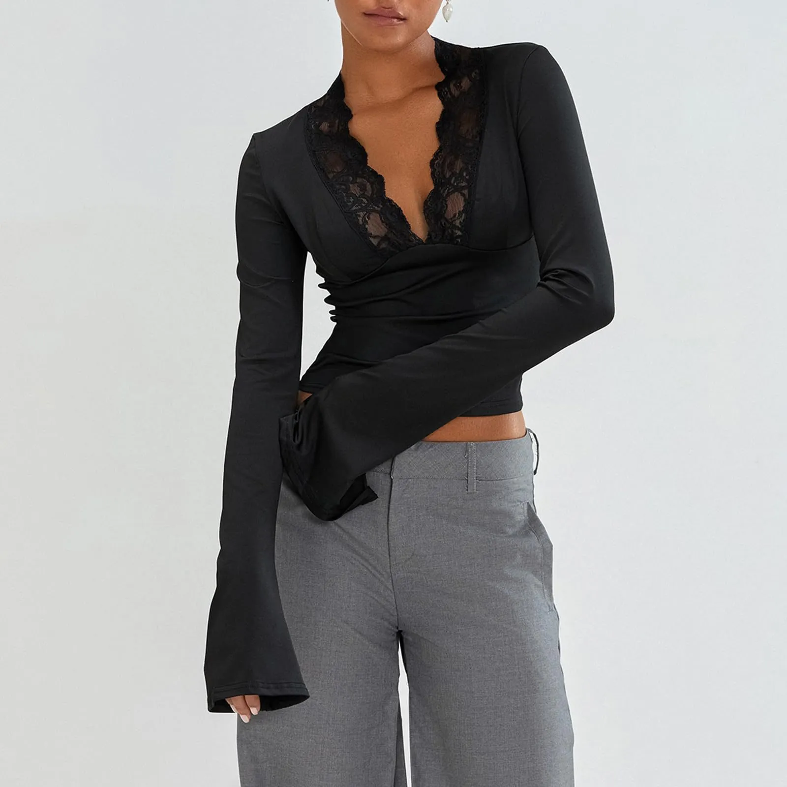 Slim V-neck Lace T-Shirt Ins Fashion Trumpet Sleeve Long-sleeved Top Women Clothing