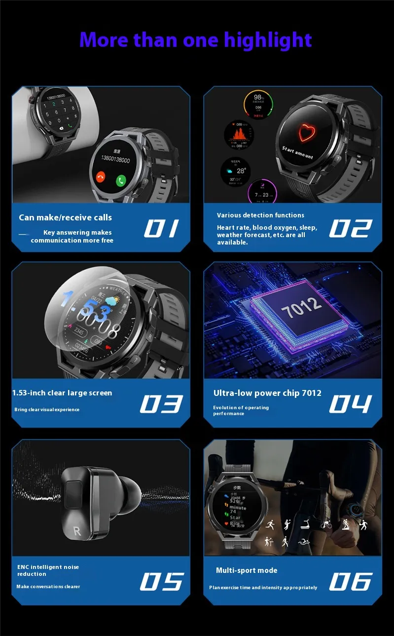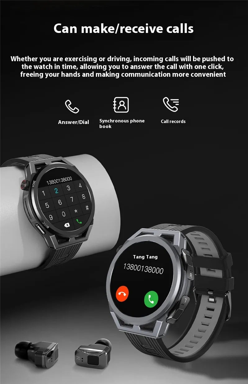 Gone are the days of juggling multiple devices. This 2-in-1 smartwatch and headset combines the best of both worlds, providing convenience and efficiency. The detachable TWS earbuds are integrated into the watch, allowing you to switch effortlessly between smartwatch and audio functionalities.