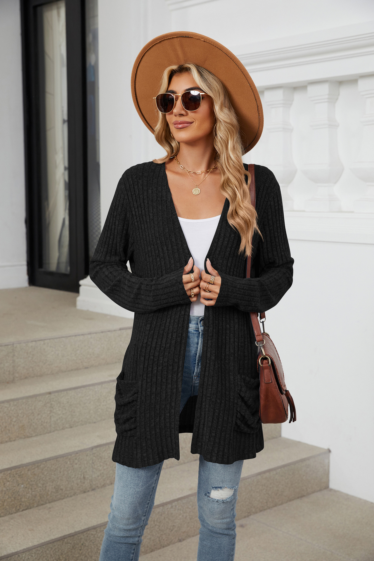 Crafted from high-quality knit material, this cardigan features a solid color design that effortlessly complements any outfit. The long sleeves provide warmth, while the open front design makes it easy to layer over your favorite tops. The cardigan also includes functional pockets, adding both style and convenience to your look. The length is perfect for providing extra coverage and creating a sleek, elongated silhouette.