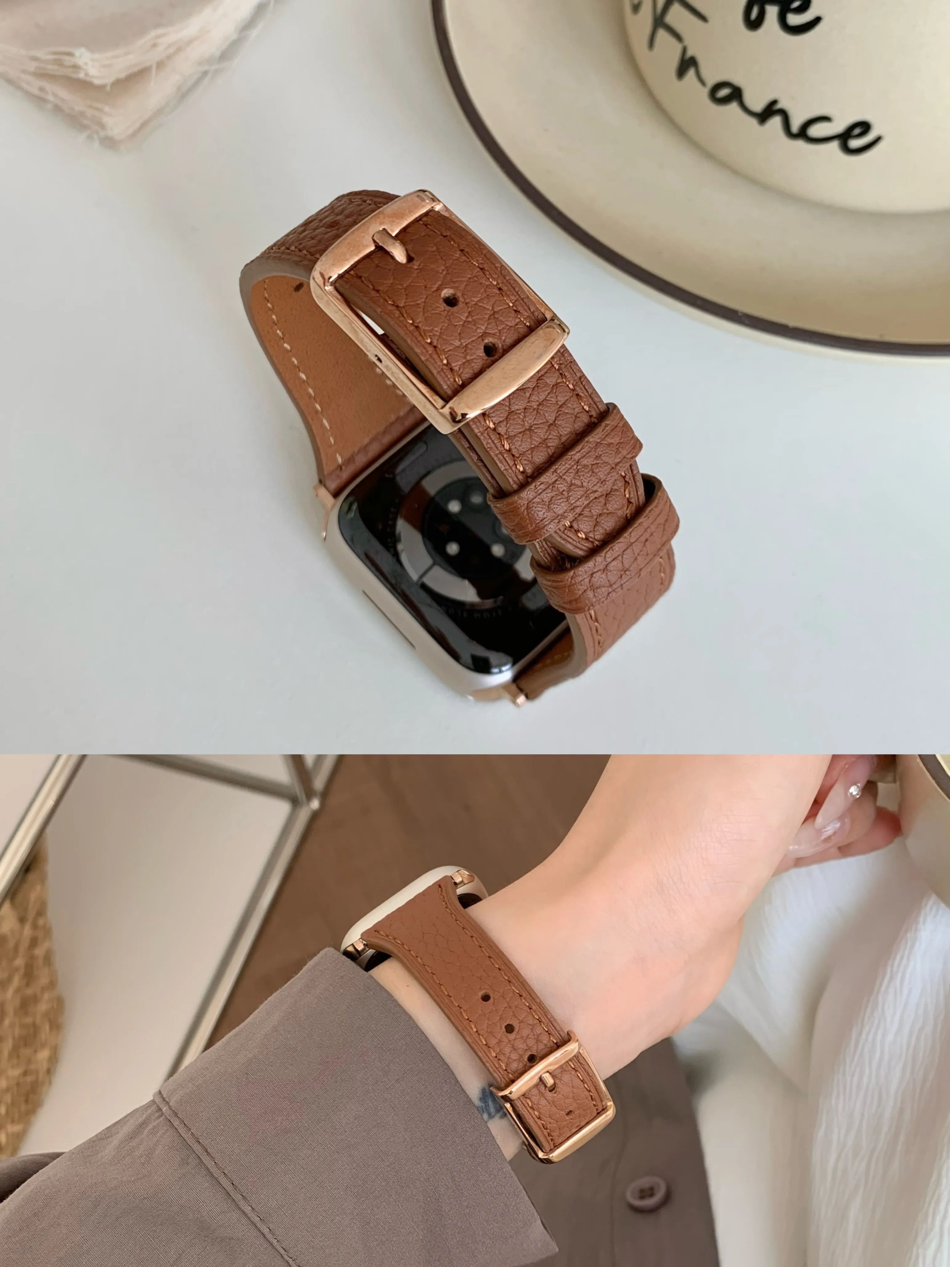 The minimalist design ensures that the strap is both timeless and fashionable, seamlessly fitting into any wardrobe. The square buckle and lychee leather create a sophisticated aesthetic that works for a variety of styles and occasions.