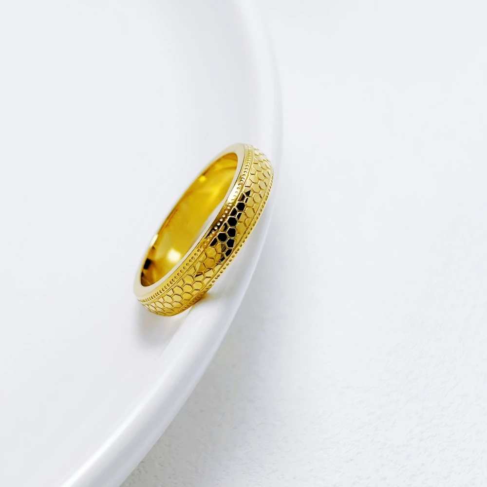 The 4mm honeycomb shape design of the ring adds a unique and modern twist to the classic band style. The intricate geometric pattern gives the ring a sophisticated and eye-catching appearance, making it stand out while remaining subtle enough for daily wear. The honeycomb texture not only looks aesthetically pleasing but also enhances the ring’s ergonomic feel, providing a smooth and comfortable fit.