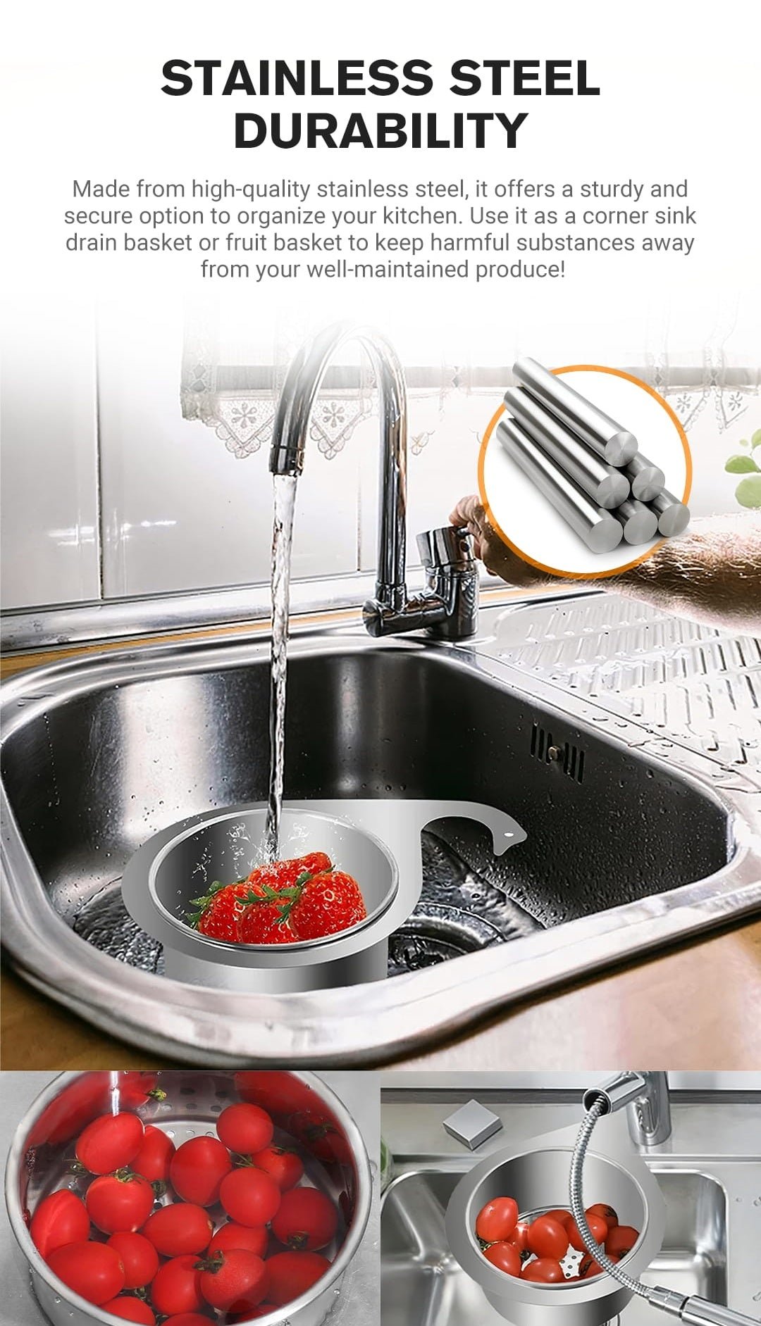 Sink food catcher basket adopt triangle structure to increase stability, clever design make full use of the space in the corner of the sink. kitchen sink filter basket can be directly and securely placed on the corner of the sink, without fear of falling, sagging or loosening. Allowing you to use kitchen sink food catcher healthily and safely.
