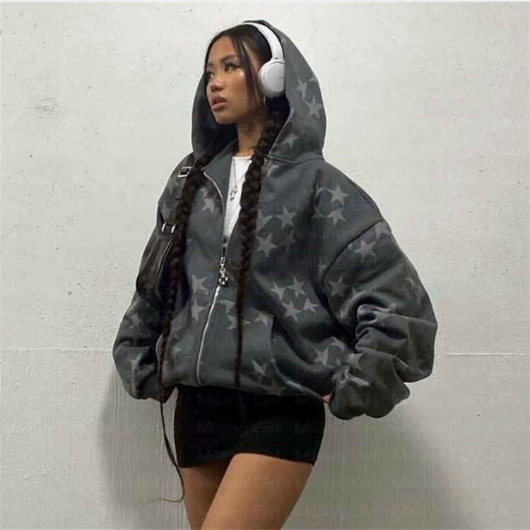 This hooded cardigan isn’t just for casual wear—it’s a versatile piece that works with a variety of looks. Whether paired with jeans, joggers, or leggings, it completes any streetwear outfit. The bold stars pattern and zipper closure give it a sporty, yet fashionable edge, making it perfect for everything from lounging at home to running errands in style.