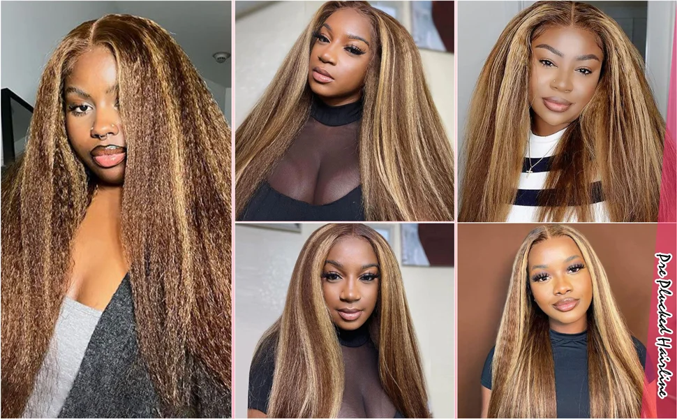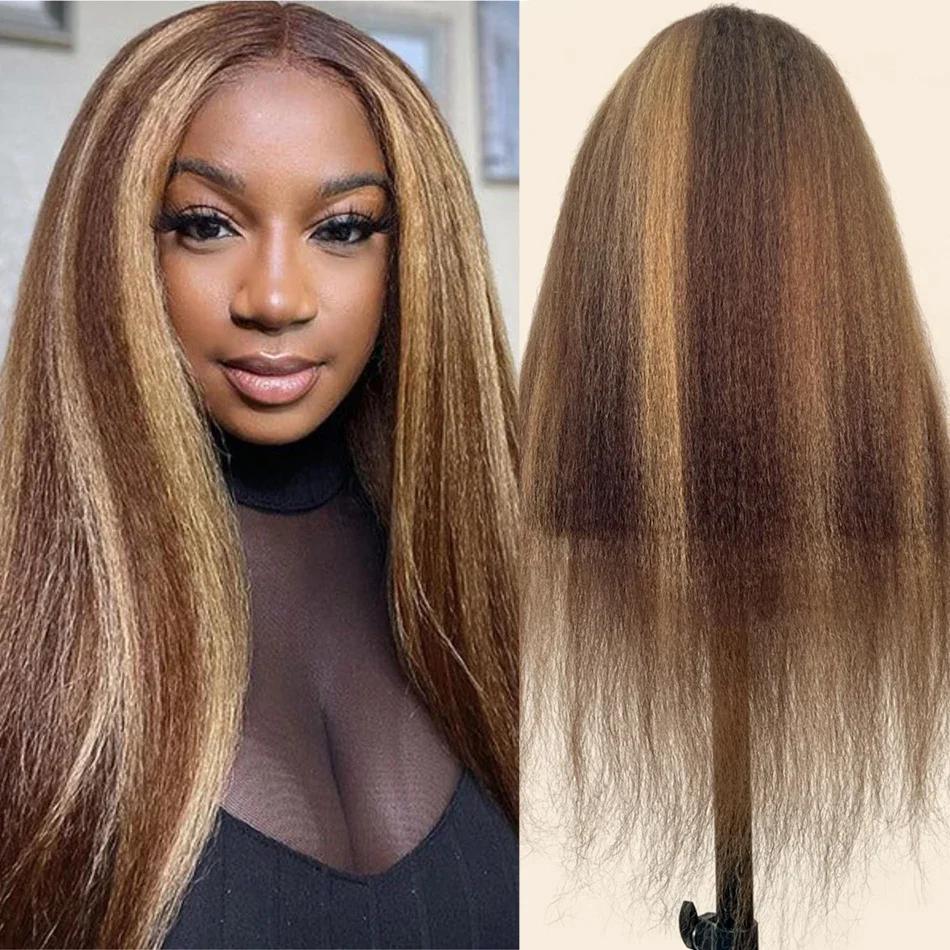 Stretched Length: 18inches, Density: 200% - 13x6 Highlight Brazilian 4/27 Brown Blonde Color Lace Wigs Kinky Straight Transparent Lace Front Human Hair Wig For Women