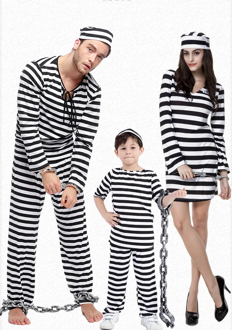 Made with high-quality materials, this costume ensures comfort and durability while providing a playful and eye-catching look. The black and white striped design is classic and instantly recognizable, making it the go-to choice for those looking to make a statement at any event. Whether you're dressing up for a family photo shoot, a costume party, or just having fun at home, the Striped Parent-Child Prisoner Costume is the ultimate choice for family fun.
