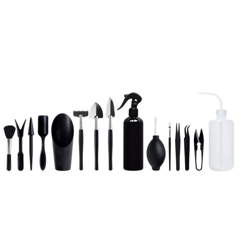 This set includes tools specifically designed for transplanting, such as mini trowels and soil scoops, which make it easy to move plants without disturbing their roots. The watering tools and tweezers are ideal for maintaining soil and cleaning small spaces, ensuring the health and aesthetics of your plants.