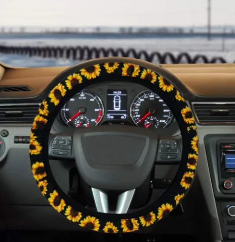 The Sunflower Steering Wheel Cover Anti-Slip Foreign Trade Keychain is a delightful and practical accessory that combines style and functionality. Its vibrant sunflower design adds a personal touch to your car’s interior while the anti-slip material provides a secure and comfortable grip for a safer driving experience. Paired with a stylish keychain, this set is perfect for anyone looking to enhance their vehicle’s aesthetics and comfort. Whether you're driving long distances or simply enjoying a short commute, this set is the ideal choice for making your car a more enjoyable place to be.