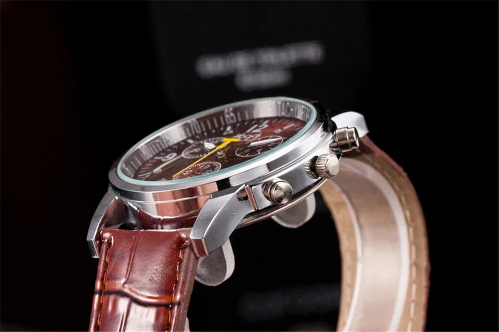 - Design: Three-eye chronograph style with multiple functional sub-dials