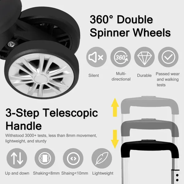 Comfortable Travel Experience: With smooth spinner wheels and an ergonomic handle, this luggage set ensures a stress-free