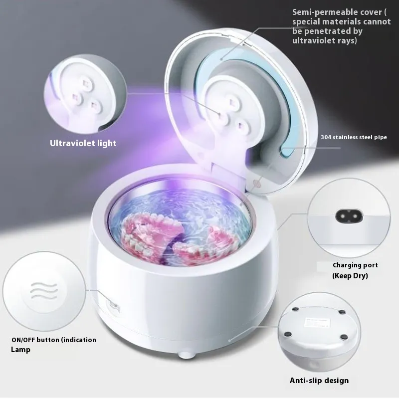 Ultrasonic cleaning uses high-frequency sound waves to generate microscopic bubbles in the cleaning solution. These bubbles penetrate every crevice of your dental appliances, dislodging debris and bacteria. The combination of ultrasonic waves and UV sterilization ensures that your dentures, tooth sockets, and retainers are not only visibly clean but also hygienically safe.