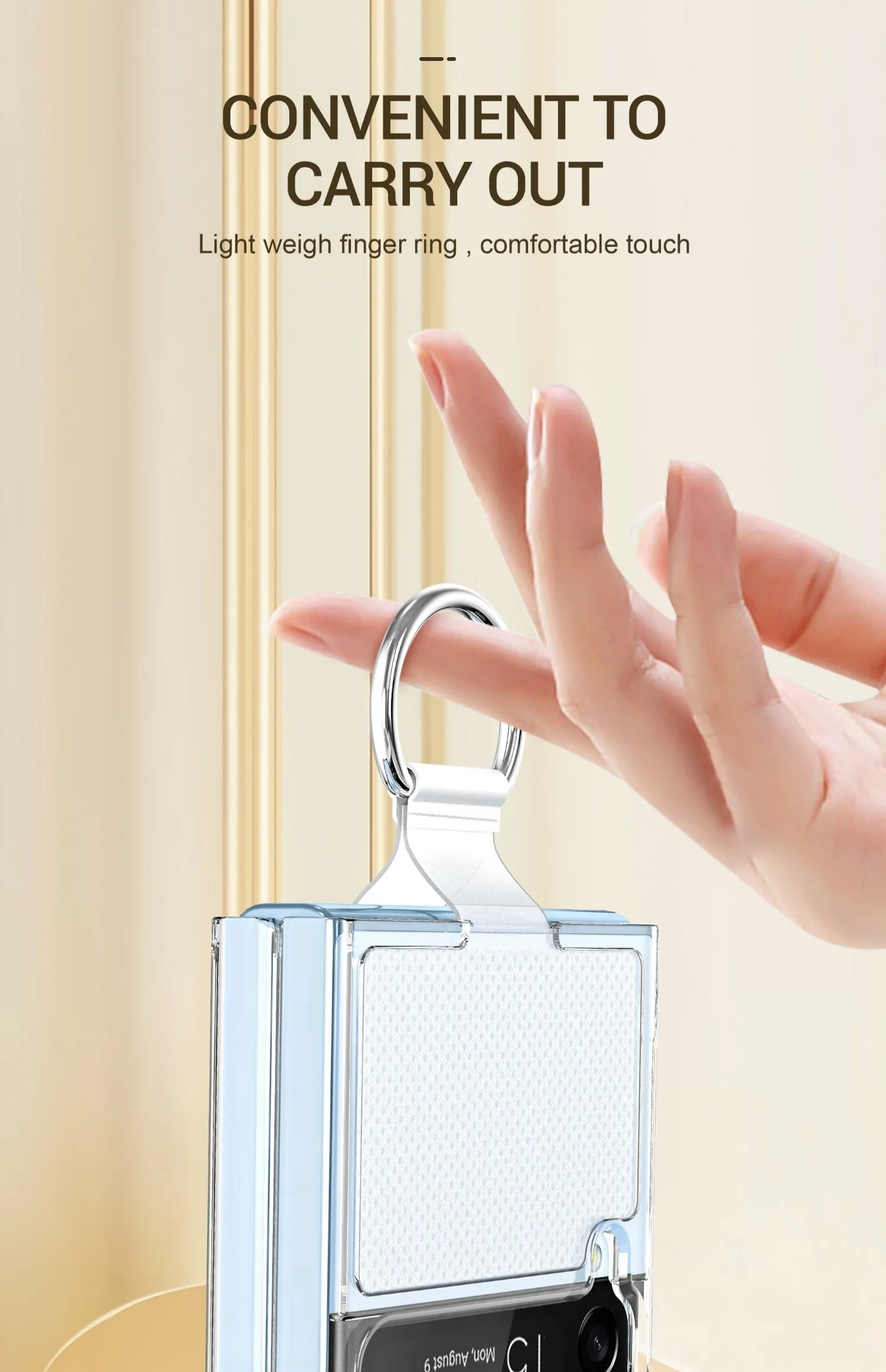 Whether commuting, working, or traveling, the Transparent Protective Case for Galaxy Z Flip4 offers both style and functionality. Its combination of clear protection and a practical fastened ring makes it a versatile accessory for everyday life.