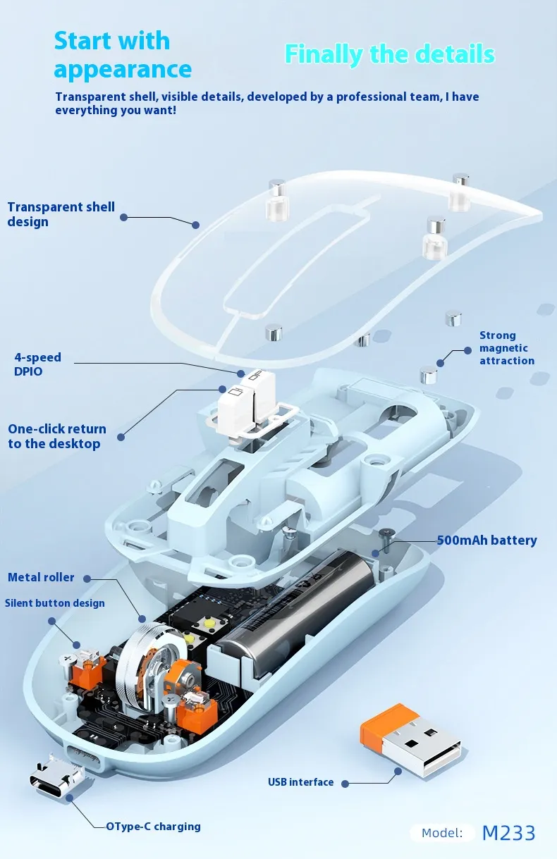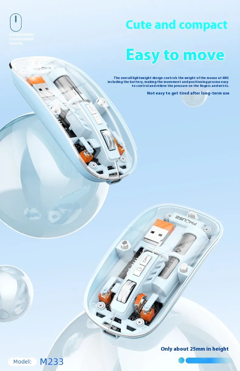 The transparent body design adds a unique and futuristic appearance, allowing you to see the inner components and enjoy a tech-inspired style. Its wireless connectivity ensures cord-free freedom, reducing desk clutter and enhancing mobility. Compatible with Windows, Mac, and other major operating systems, this mouse is versatile for various devices.
