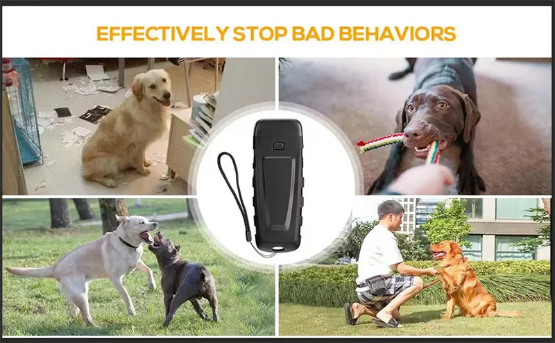 3 modes & LED Flashlight : 1nd gear ultrasonic mode to assist in daily dog training such as stop excessive barking, fighting, biting, and correct other unwanted behaviors, 2nd gear ultrasonic LED mode will not only emit an ultrasonic sound, but it will also quickly LED flash the bright LEDs and stop a dogs’ behavior. 3nd gear the bright flashlight can also be turned on and used to light your way home.