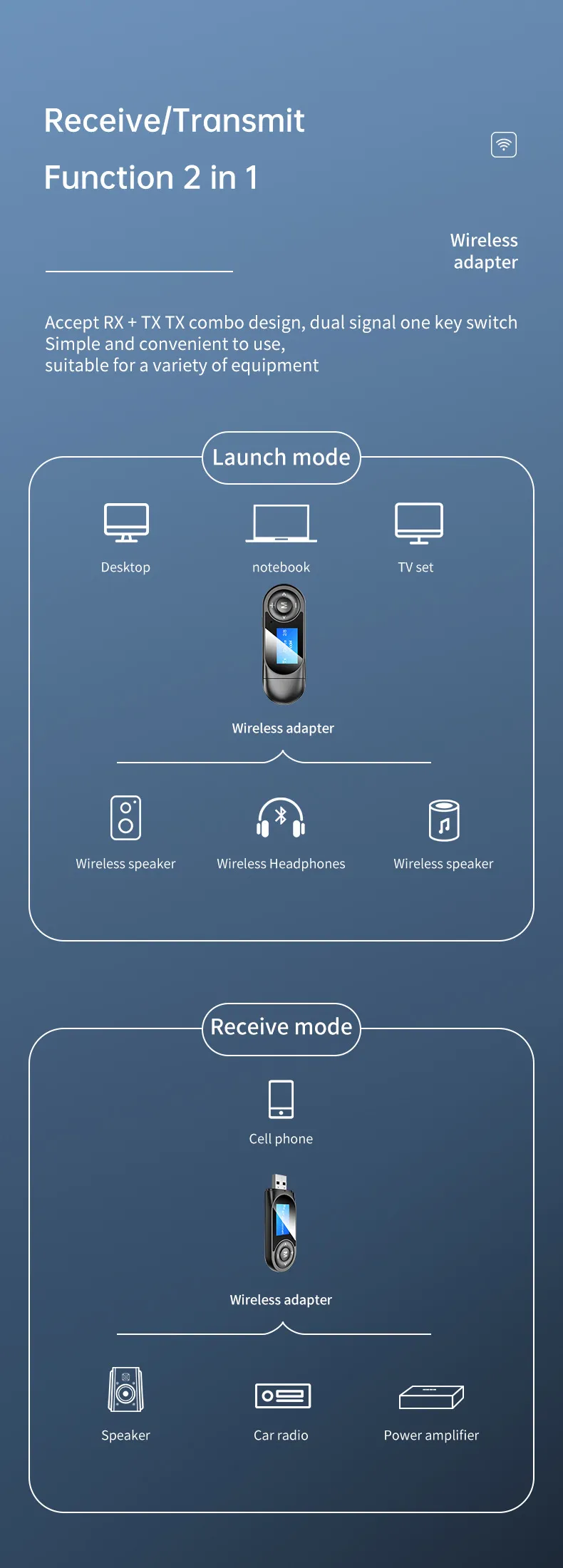 Upgrade your audio system with the USB Bluetooth Audio Transmission Receiver. Its Bluetooth 5.0 technology, easy setup, and compact design provide a simple and effective way to enjoy wireless audio streaming. Whether you're enhancing your home entertainment system, car audio, or personal listening experience, this receiver ensures seamless connectivity and high-quality sound.