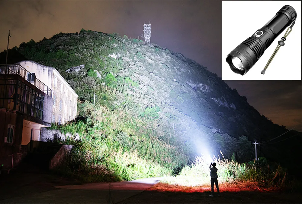 projector. Can illuminate a distance of 200 to 500m. The flashlight with built-in battery (26650 or 18650) can be charged via USB