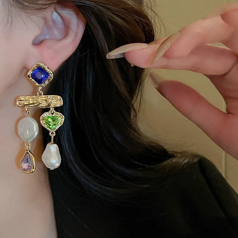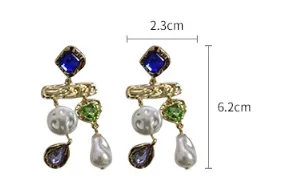 Color: Silver Needle-blue rhinestone pearl earring drops, Silver Needle-champagne rhinestone pearl earring drops