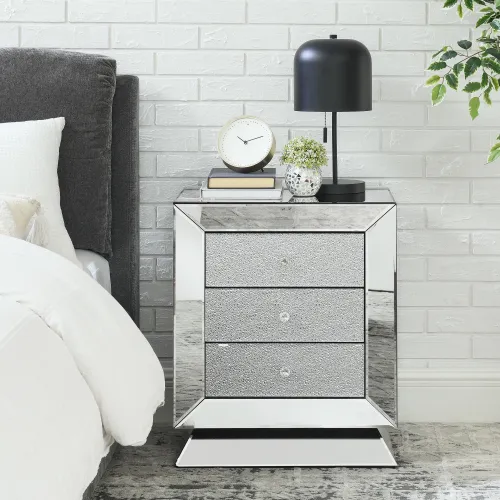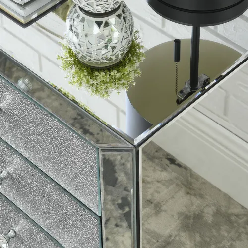 The Elegant Mirror Three Drawer Cabinet offers the perfect blend of style, practicality, and luxury. With its mirror inlaid drawers, it not only provides ample storage space but also enhances the visual appeal of any room. The diamond glass mirror accents reflect light, creating a sense of openness and brightness, perfect for smaller spaces.