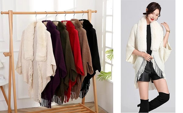 Winter Knit Fringe Fur Collar Shawl