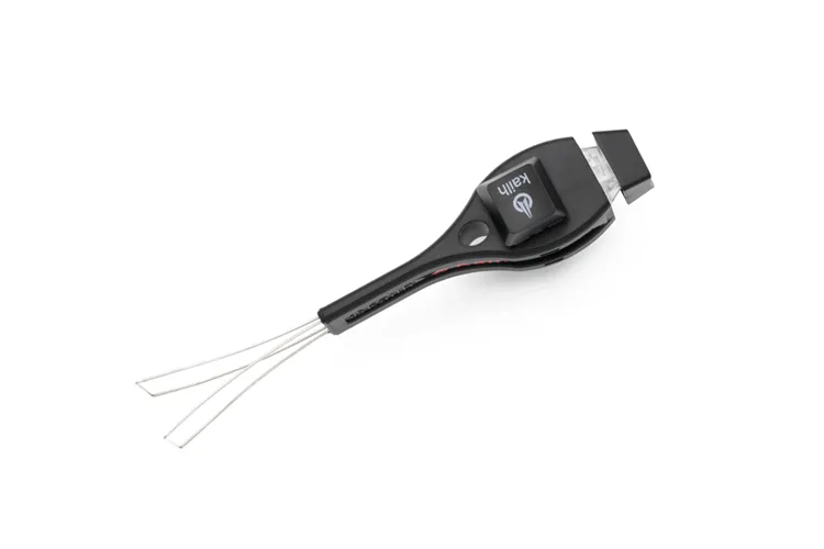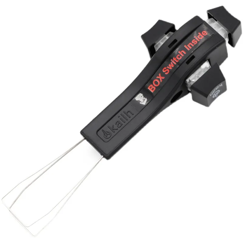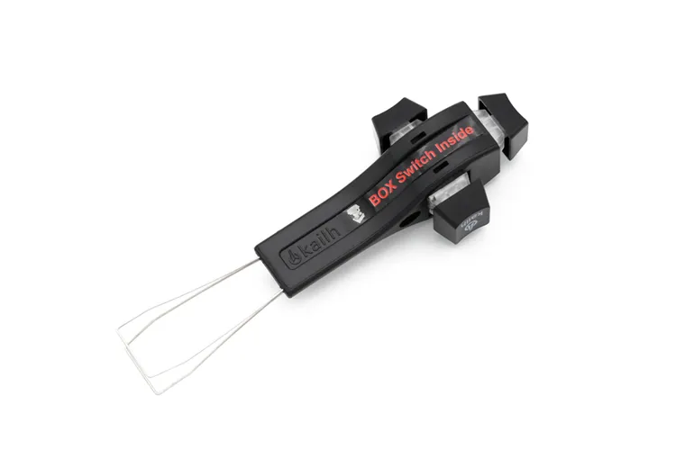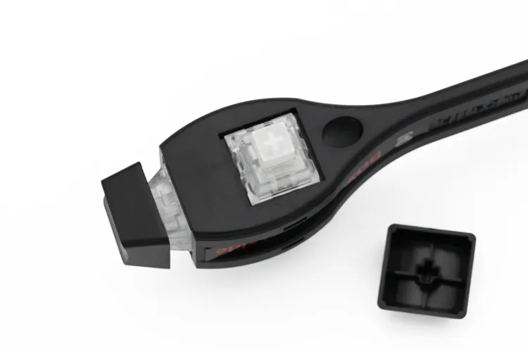 A wire puller tool is used to safely remove keycaps and mechanical switches without damaging them, making keyboard customization easy.