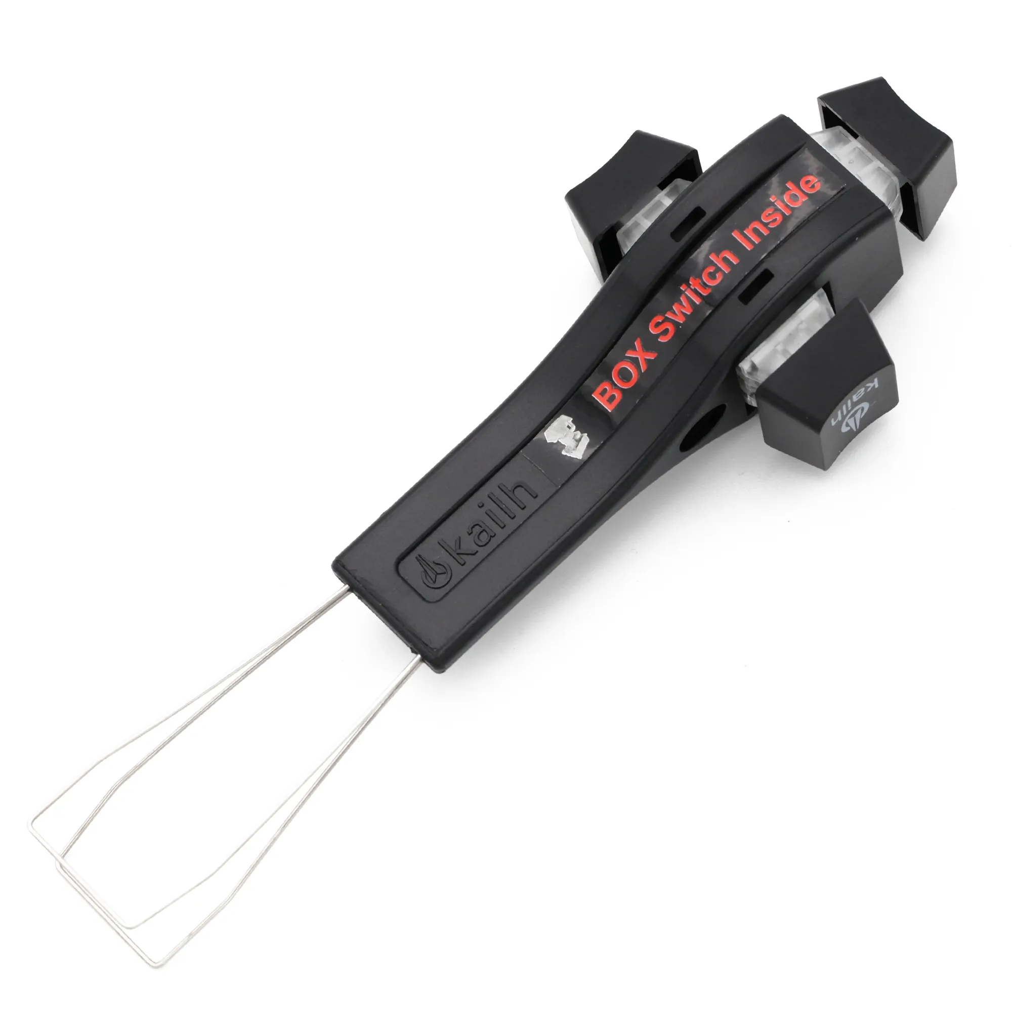 A wire puller tool is used to safely remove keycaps and mechanical switches without damaging them, making keyboard customization easy.